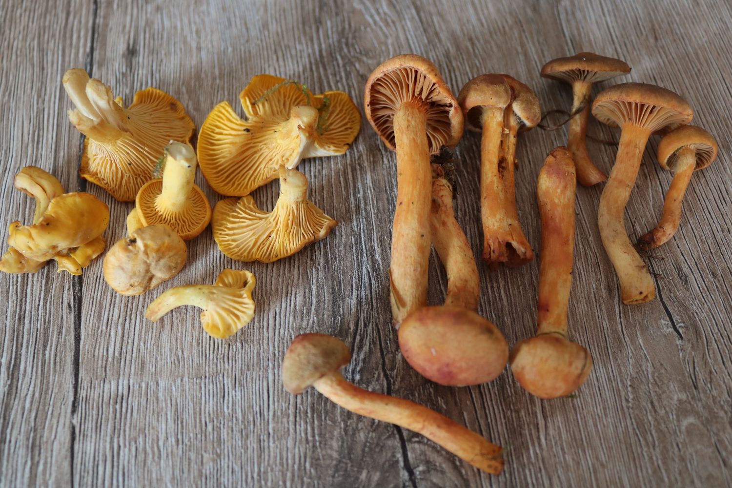 Hier der aussortierte Pilz der mit den Filzigen Gelbfüssen zusammen wuchs (im Bild links, Filziger Gelbfuss zum Vergleich rechts). Diesen habe ich aussortiert. Die Lamellen laufen nicht herab und die Lamellenfarbe ist anders. Farbton ist grundsätzlich etwas anders, dunkler, rötlicher. Die Lamellen stehen dichter und sind schmaler: