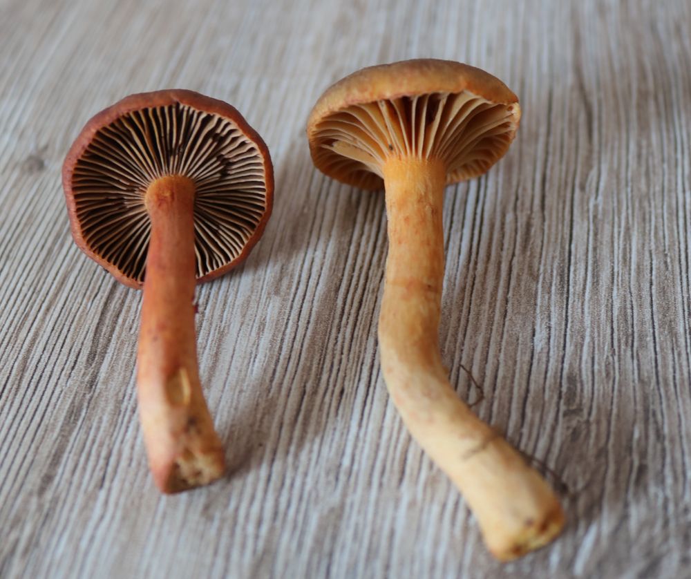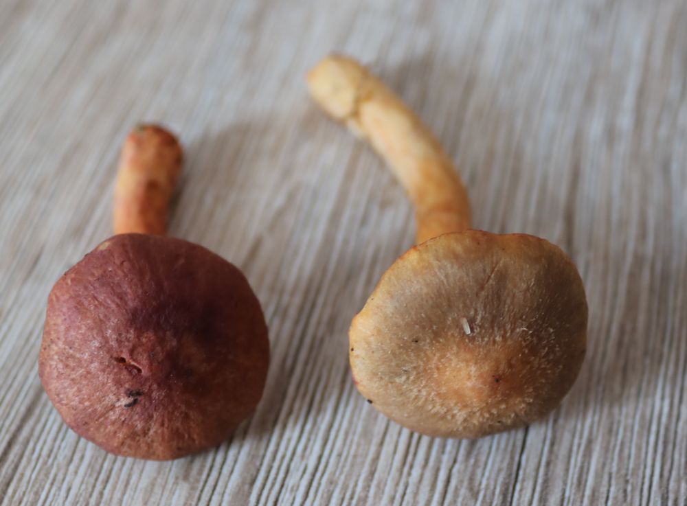 Hier der aussortierte Pilz der mit den Filzigen Gelbfüssen zusammen wuchs (im Bild links, Filziger Gelbfuss zum Vergleich rechts). Diesen habe ich aussortiert. Die Lamellen laufen nicht herab und die Lamellenfarbe ist anders. Farbton ist grundsätzlich etwas anders, dunkler, rötlicher. Die Lamellen stehen dichter und sind schmaler:
