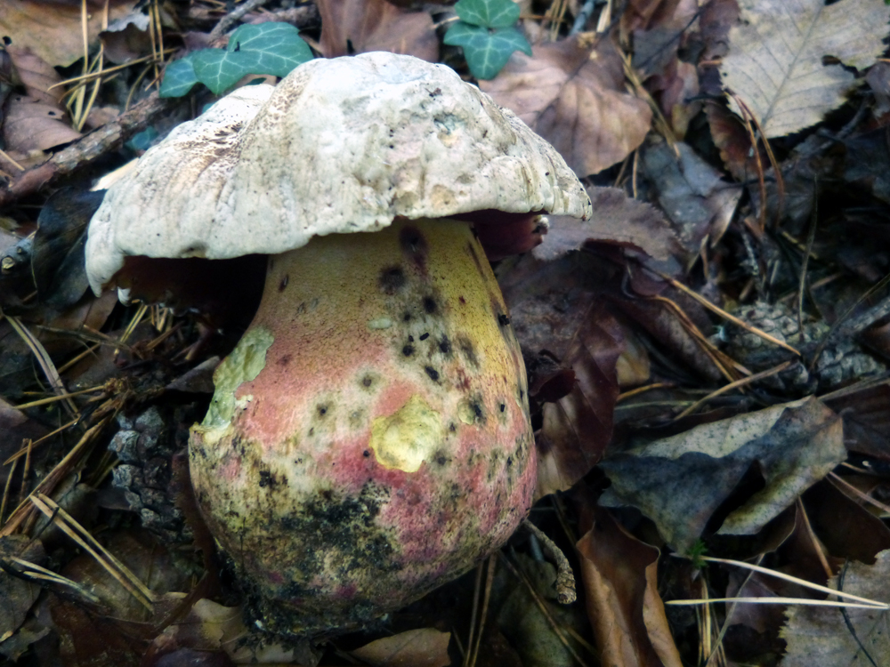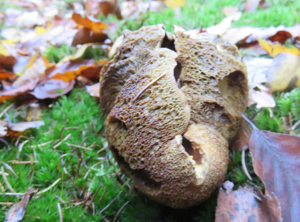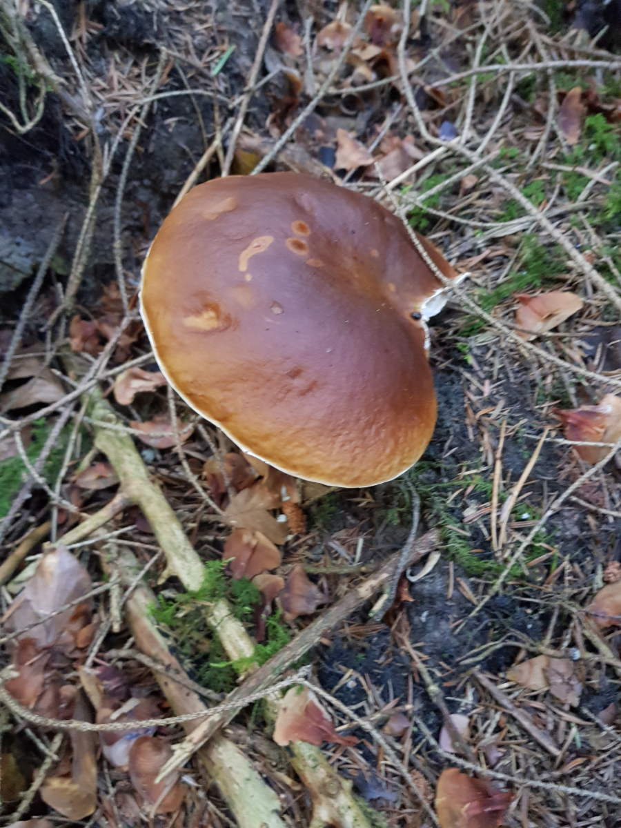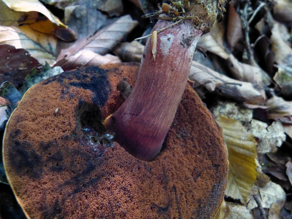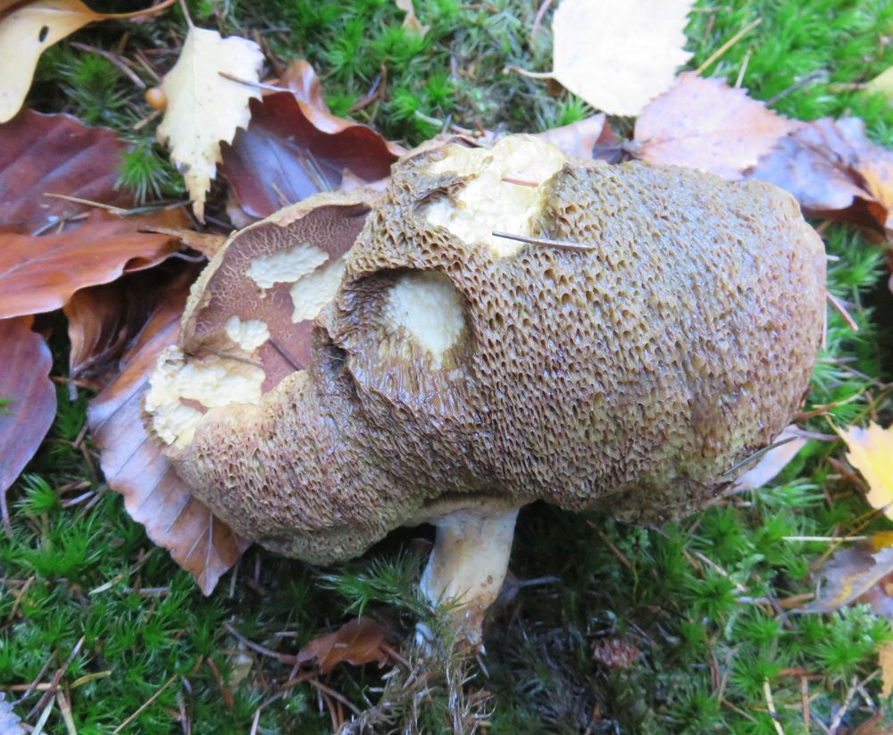 Eine Kuriosität: der Hut dieser Marone hat sich nach dem Aufschirmen so stark nach oben gebogen, dass der Pilz wie ein Kebap am Stiel ausieht :) Nicht mehr essbar, natürlich.