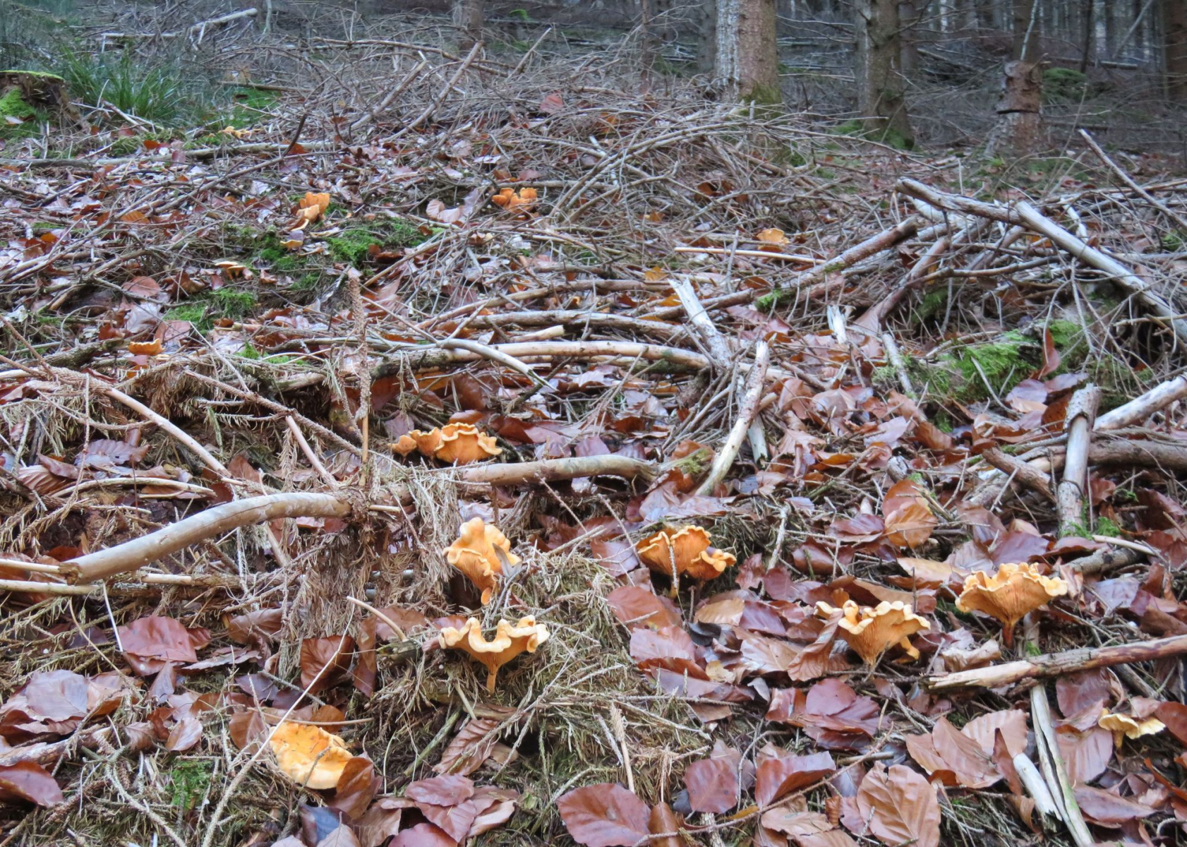 gerade zurück von unserer sechsten und letzten Pilz-Lehrwanderung in 2018. Kurz vor 9 Uhr hörte es auf zu regnen, sodass wir fast pünktlich starten konnten. Unser heutiges Fundziel war der Rauchblättrige Schwefelkopf, von dem wir aber leider nur wenige Einzelexemplare finden konnten. Dagegen gab es wieder haufenweise Falsche Pfifferlinge, von ganz hellgelb bis dunkelorange, in ganz unterschiedlichen Größen, nebeneinander im gleichen Waldstück. Wie viele Arten mögen sich dahinter verbergen, oder doch alles nur dieselbe Art? Gut war, dass wir auch den Gifthäubling fanden, dieser wurde vor Ort eingehend besprochen.