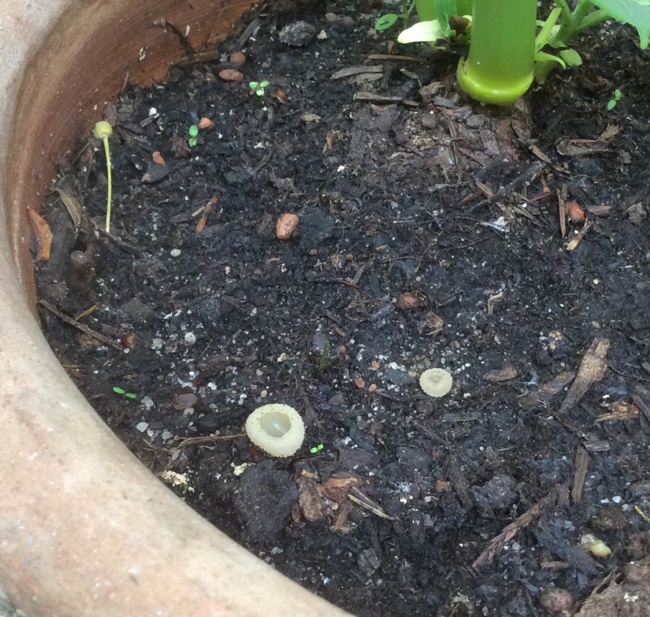 Nach dem Fund waren wir 5 Tage verreist. Gestern erst kam ich dann dazu, nochmal in den Blumentopf zu schauen: Der kleinere FK war überhaupt nicht mehr zu sehen, der größere gerade noch so als verschrumpeltes dunkelbraunes Ding. Größer war er nicht geworden. Ob da noch was an Sporen rauskommt, bezweifle ich.