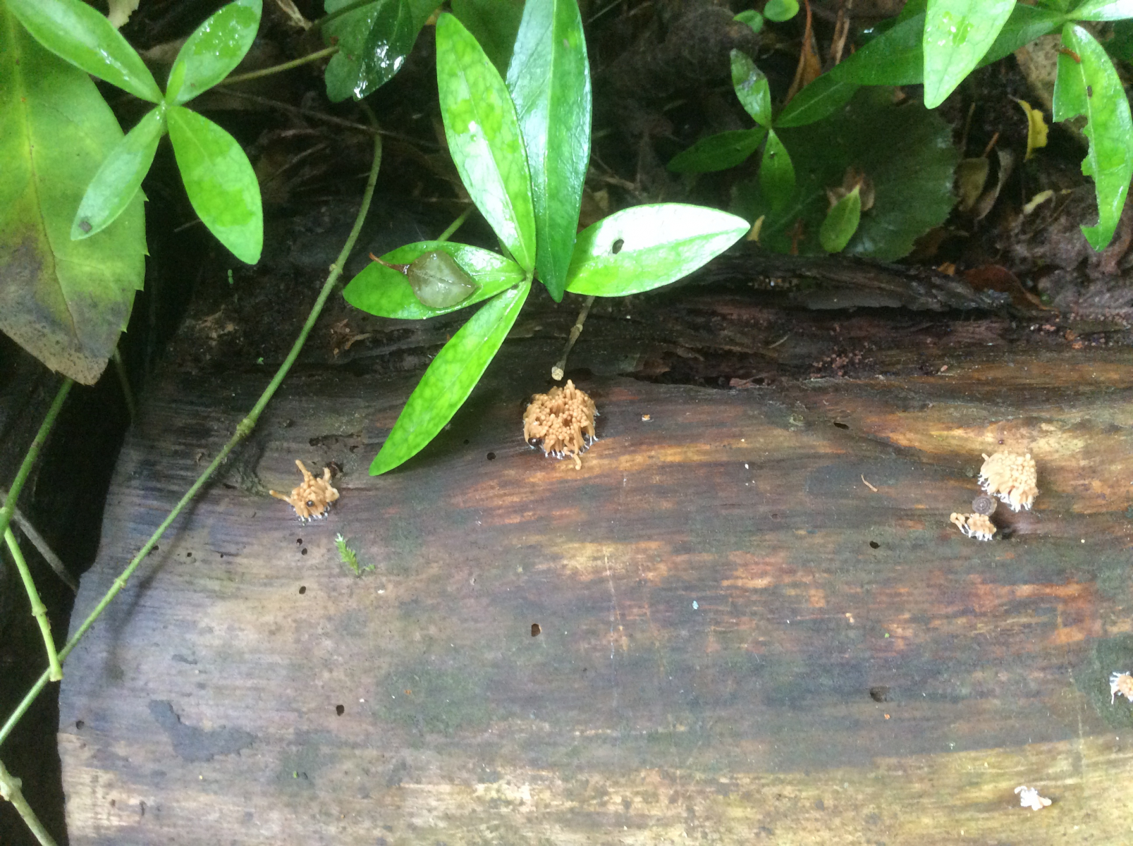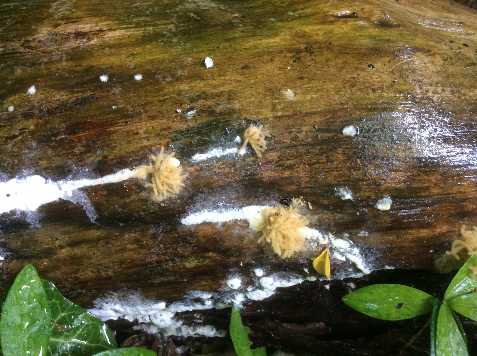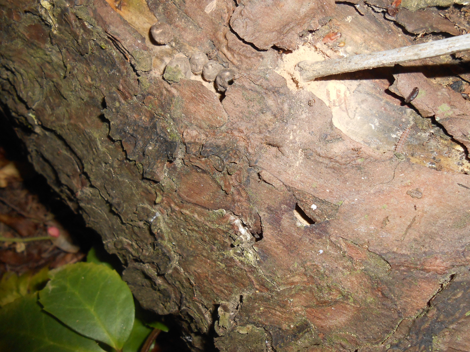 Gehört das weisse "Zeugs" zu dem Schleimpilz? Und dazwischen kommen noch feste, braune "Bobbelchen" raus: Blutmilchpilze?
