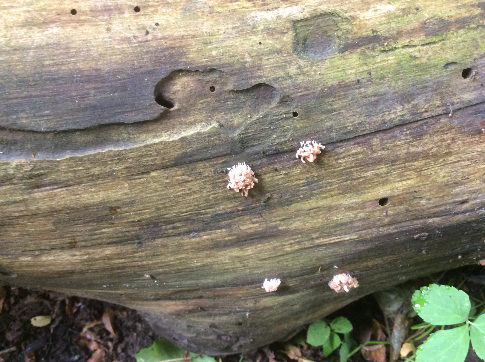 Nach langer Hitze und Trockenheit sind der weiße Pilzbelag und die Arcyrias vollkommen verschwunden; jedenfalls ist äußerlich nichts mehr davon sichtbar auf dem Holz.