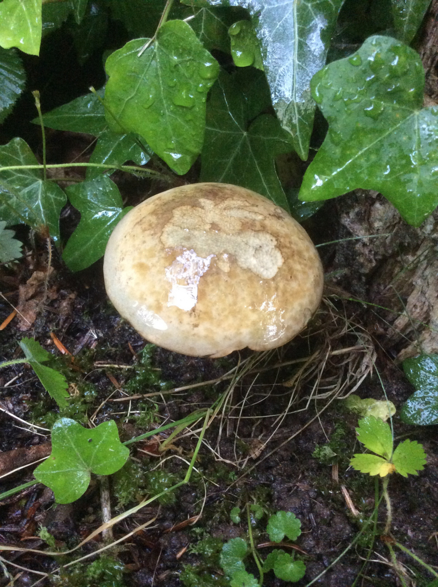 als ich eben den Garten goß (auch bei uns ist es inzwischen schon ziemlich lange trocken!), was erblickten da meine müden Augen? Einen Pilz, ein richtiges "Schwammerl", also einen Röhrenpilz!