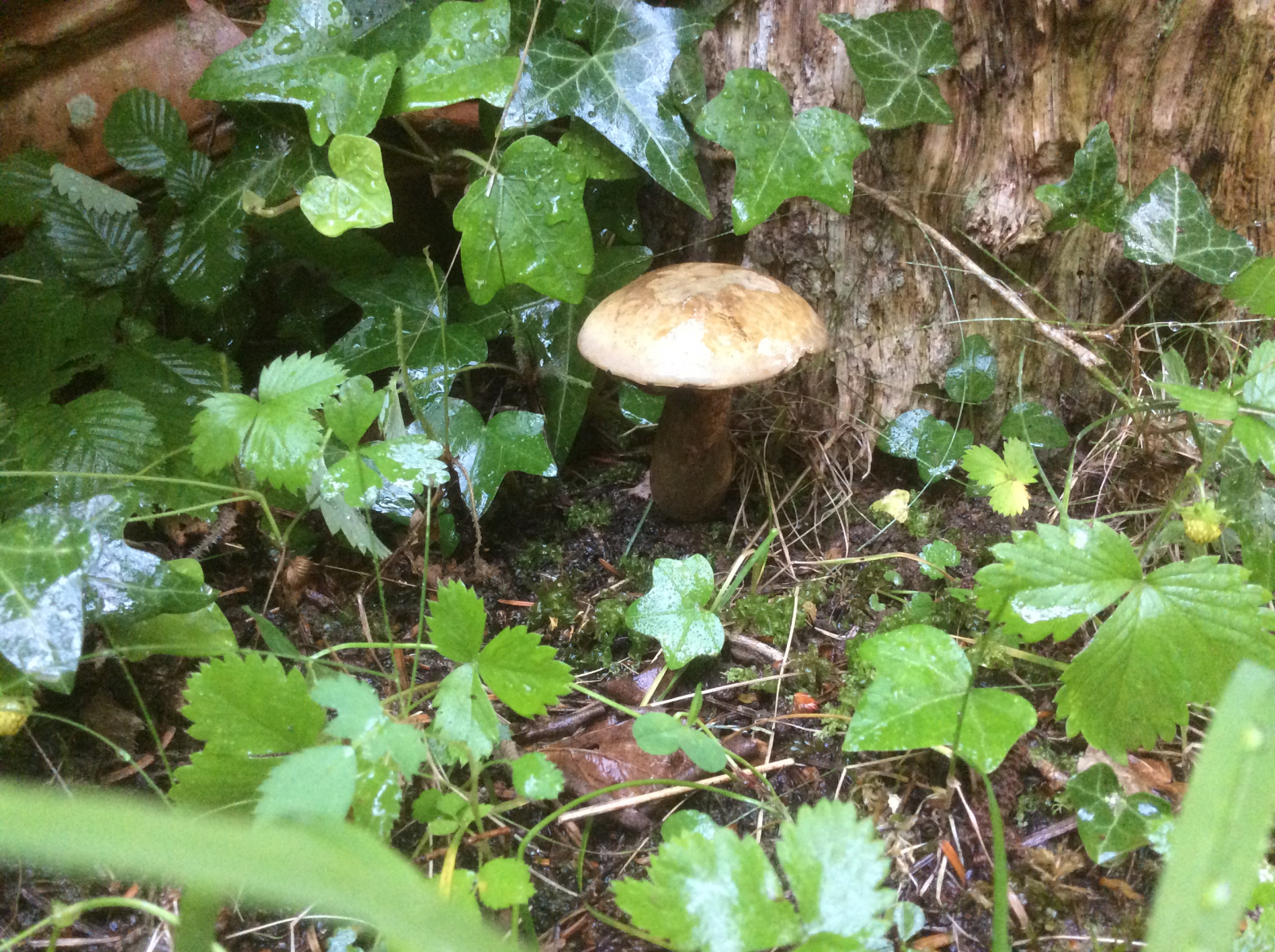 als ich eben den Garten goß (auch bei uns ist es inzwischen schon ziemlich lange trocken!), was erblickten da meine müden Augen? Einen Pilz, ein richtiges "Schwammerl", also einen Röhrenpilz!