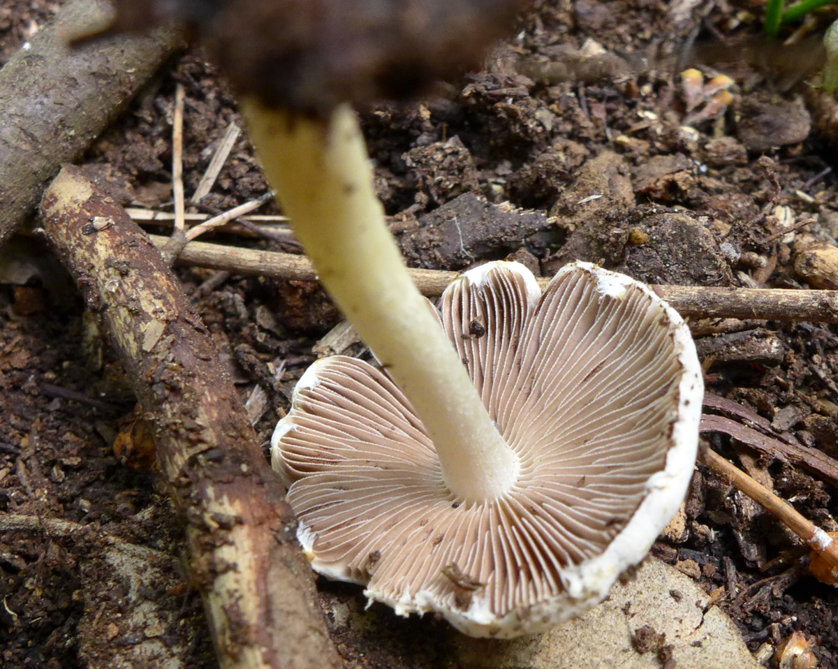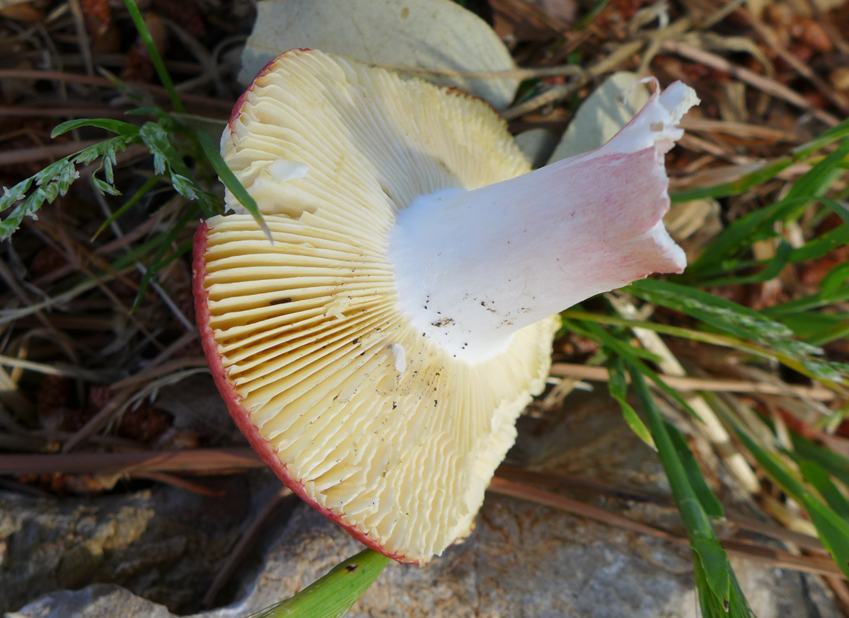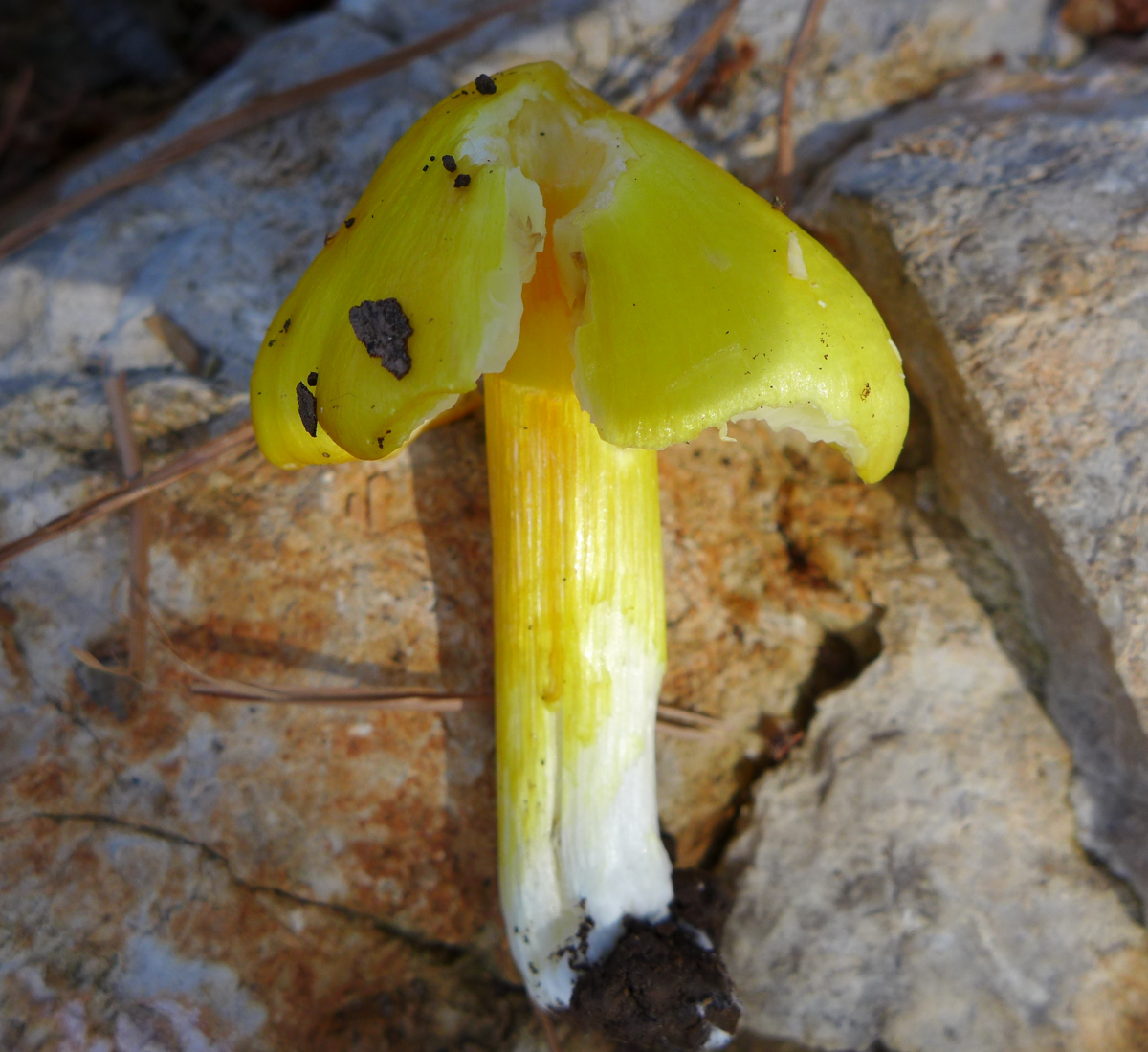 So einen ähnlichen hatte ich im Spätherbst in Ligurien schon mal getroffen ( Was gegen die Kälte). Damals war die Bestimmung unsicher, diesmal würde kalkiger Untergrund auf jeden Fall gut zum stumpfen passen, und herumgeknutscht habe ich auf Oehrlings damalige Anregung hin auch mit dem Pilzlein: Hut und Stiel schleimig.