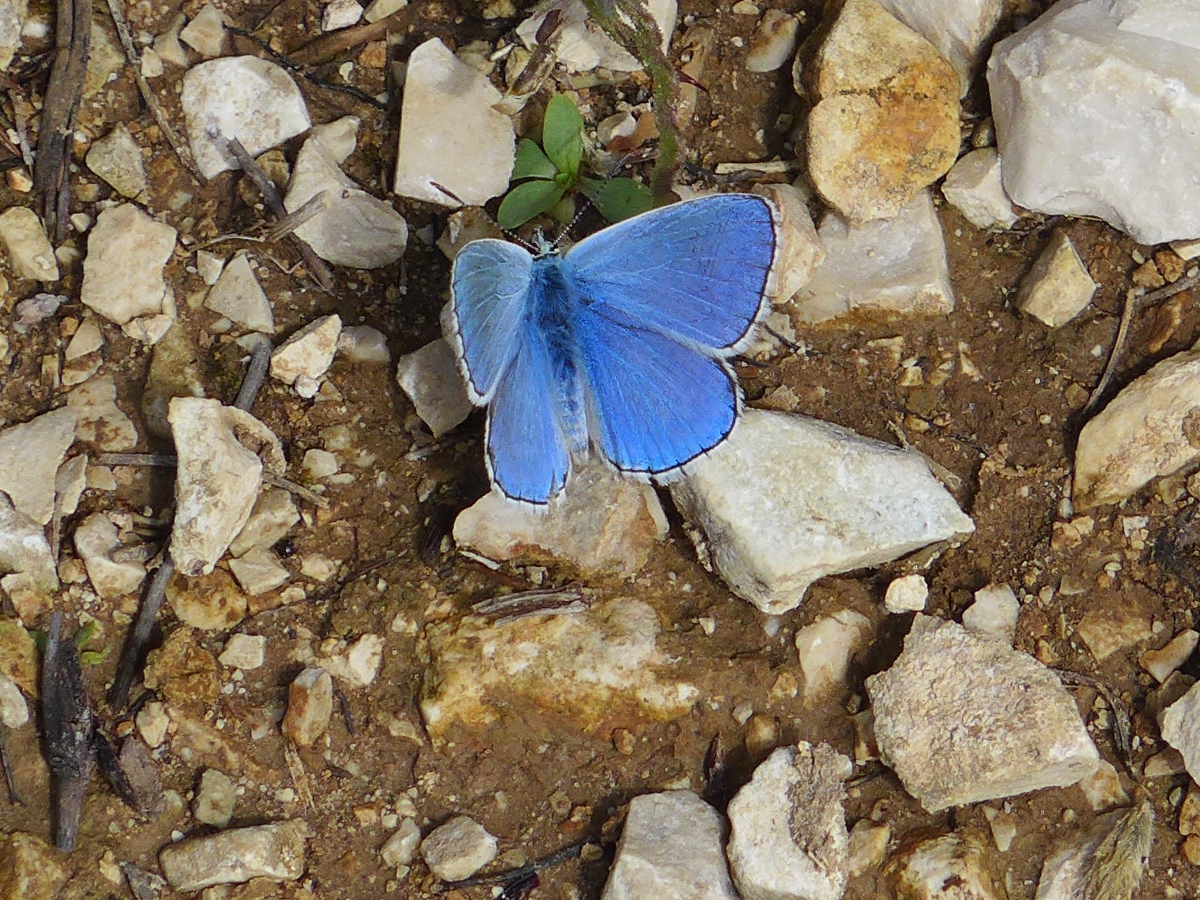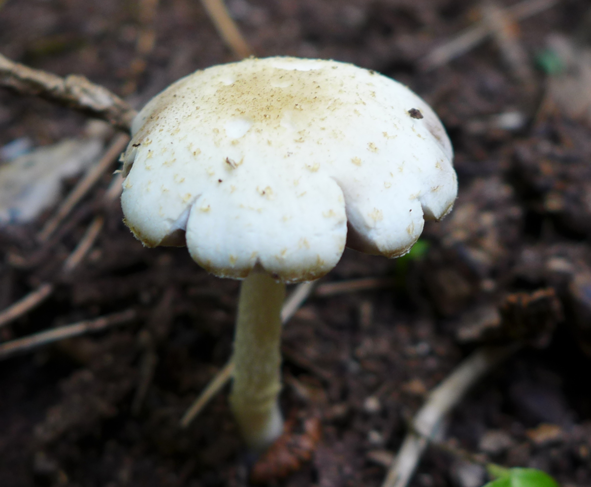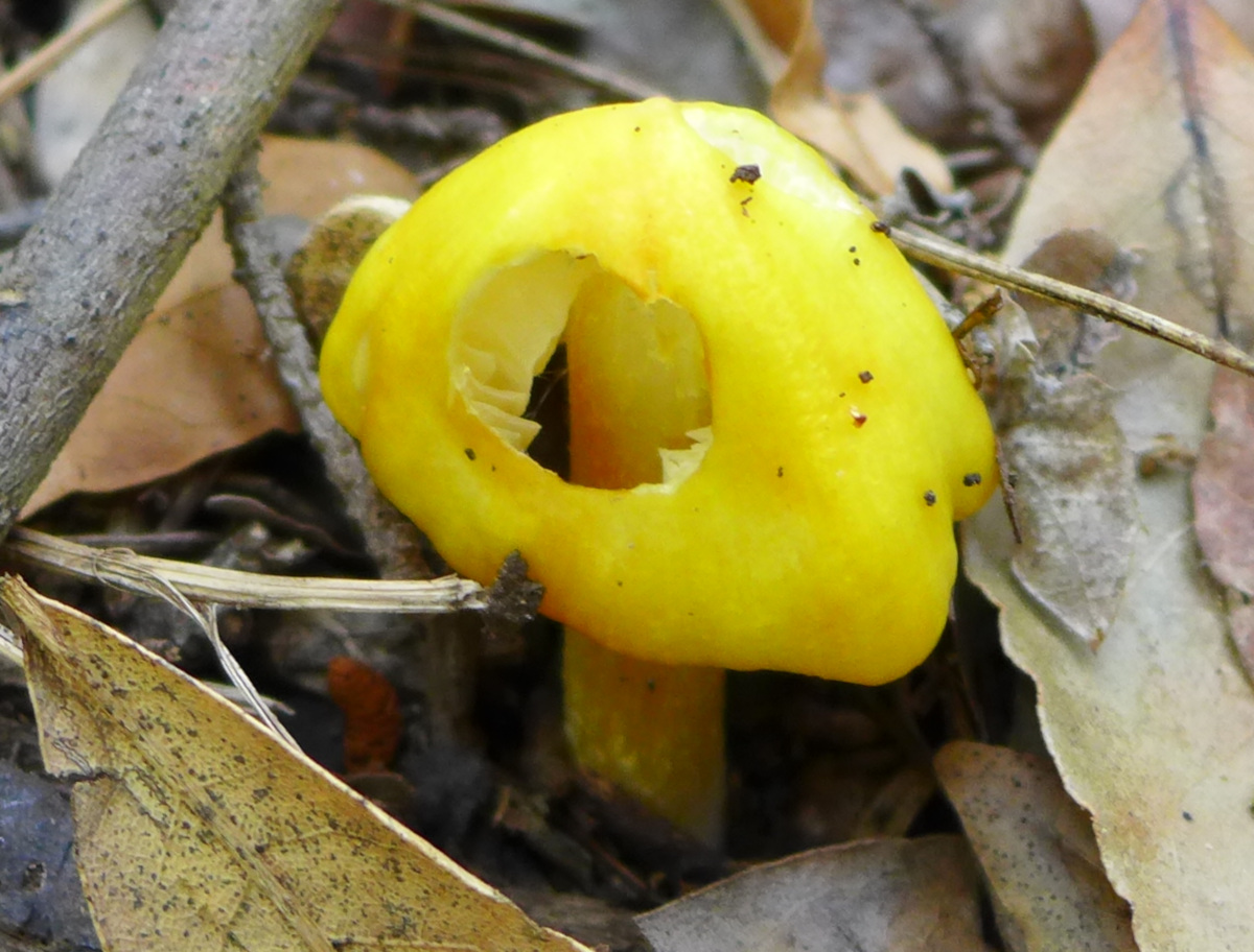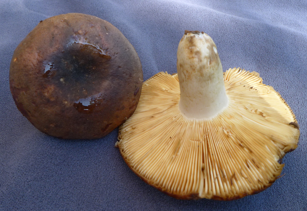 So einen ähnlichen hatte ich im Spätherbst in Ligurien schon mal getroffen ( Was gegen die Kälte). Damals war die Bestimmung unsicher, diesmal würde kalkiger Untergrund auf jeden Fall gut zum stumpfen passen, und herumgeknutscht habe ich auf Oehrlings damalige Anregung hin auch mit dem Pilzlein: Hut und Stiel schleimig.