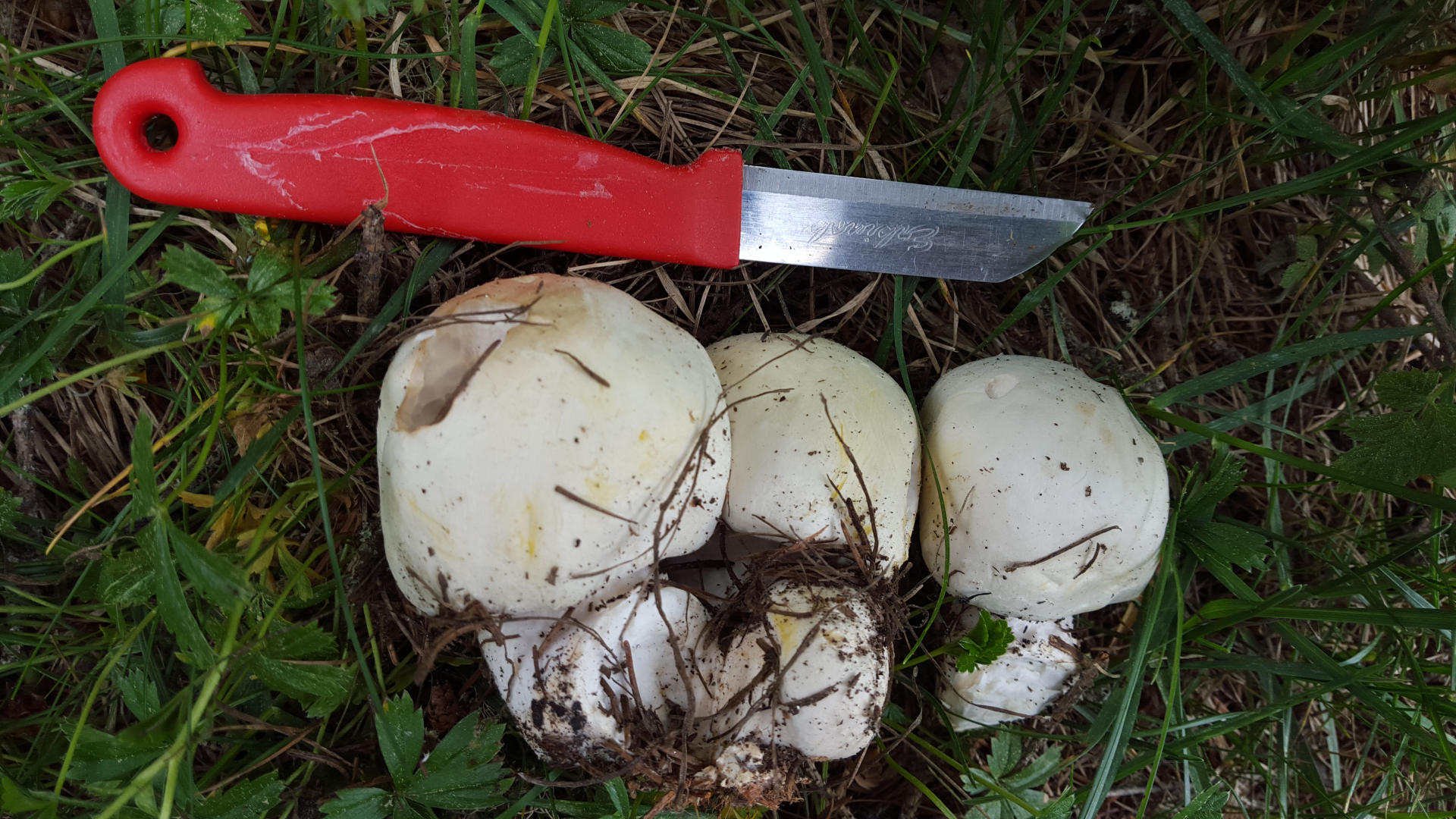 - alle FK noch sehr jung und nicht aufgeschirmt. Größenverhältnisse sieht man ganz gut im Vergleich zum Messer, könnten sich ausgewachsen zu relativ großen Pilzen mausern
