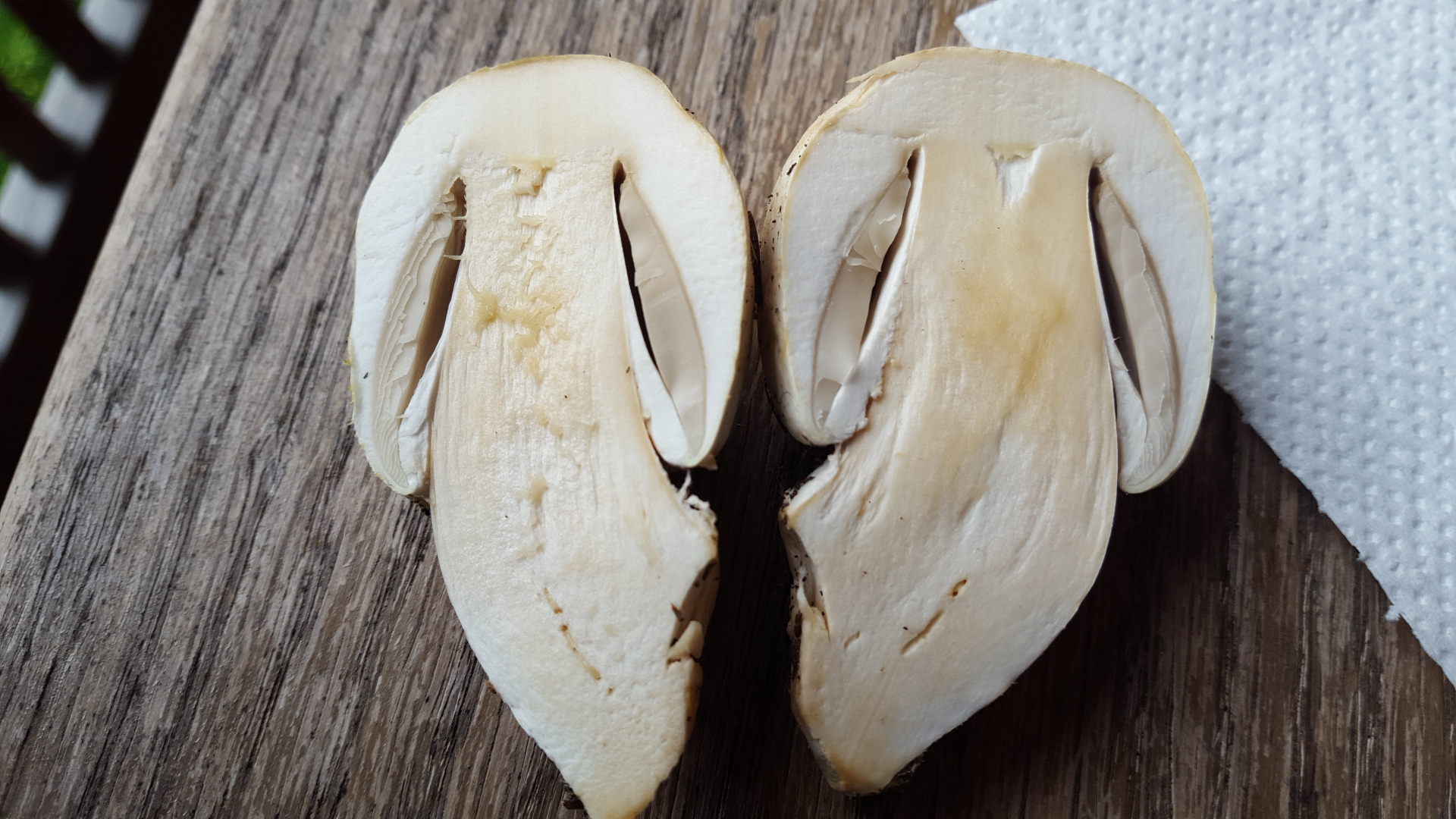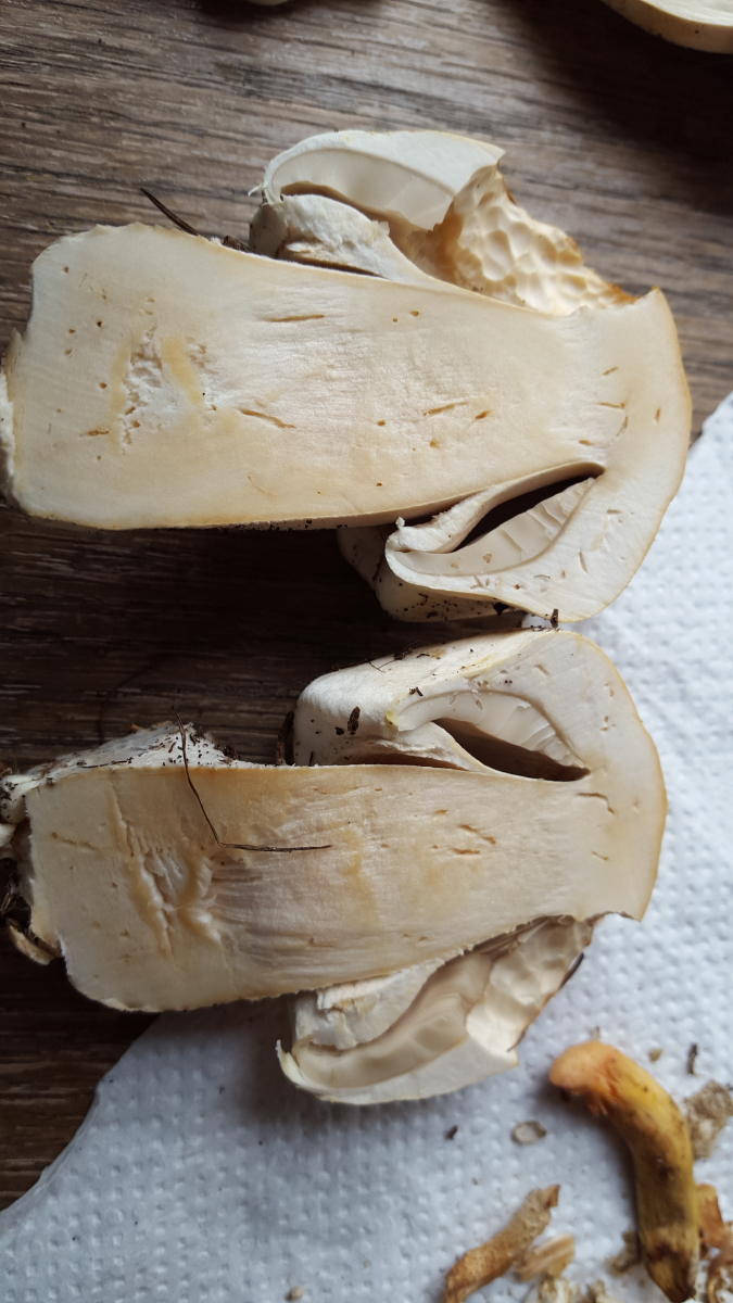- Fleisch weiß, beim Durchschneiden langsam ganz leicht ins rötliche verfärbend, nicht gilbend