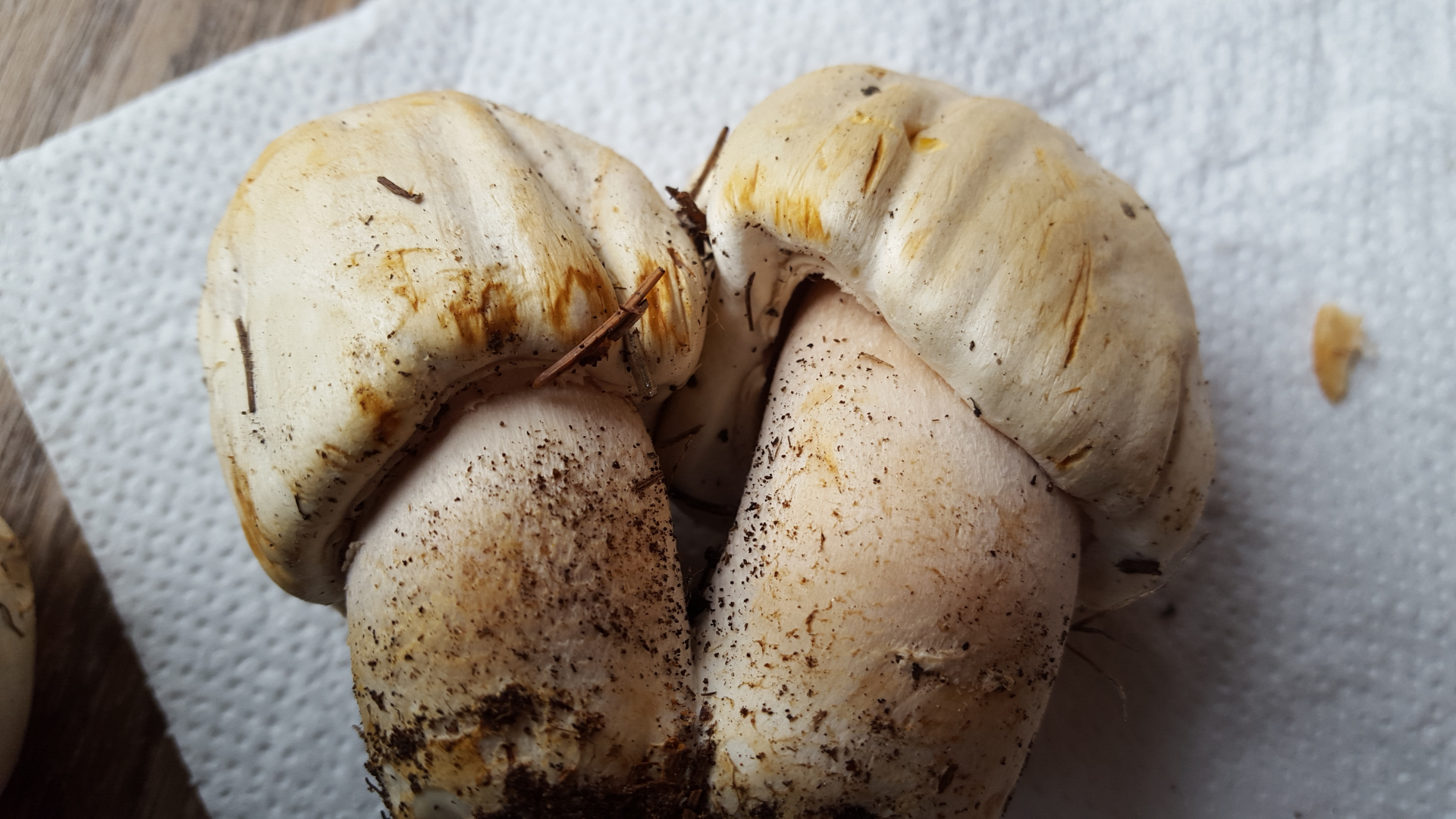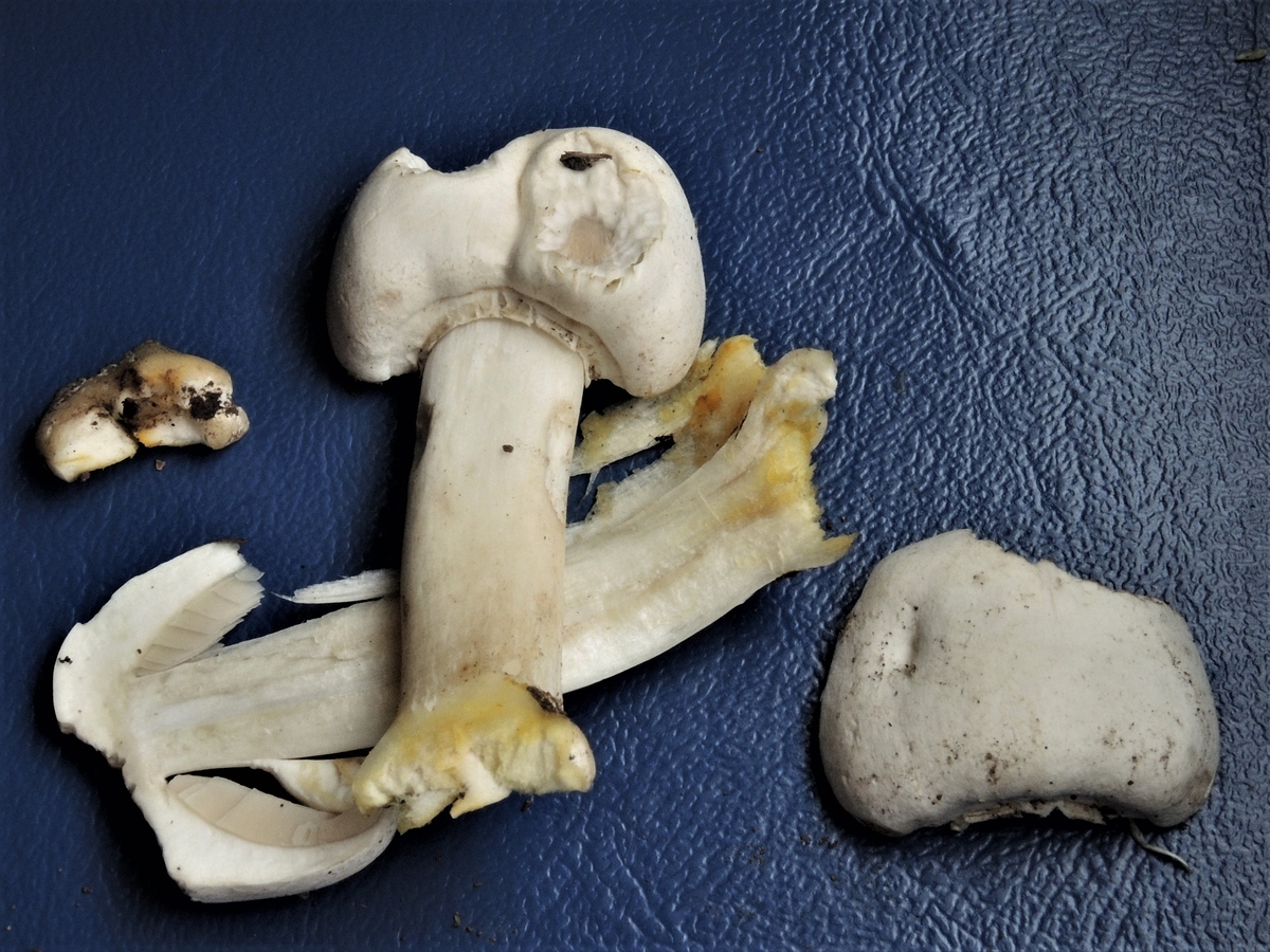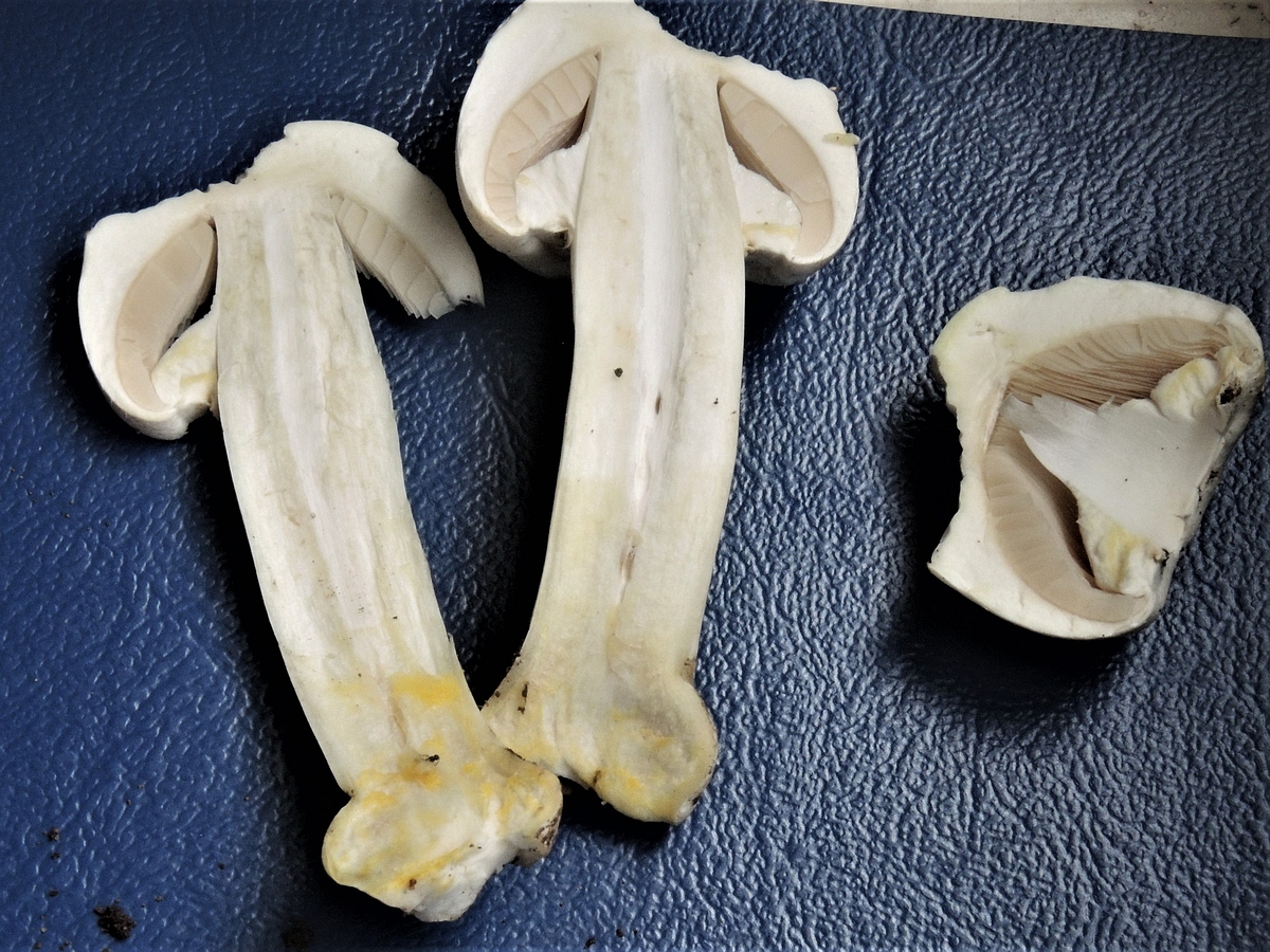 - Stiele scheinen feinbeflockt, mit einem ganz leicht fleischrosa? Schein; Stielbasis kaum verfärbend, Farbumschlag ähnlich wie auf Huthaut (weder beim Ärgern noch beim Durchschneiden stark gilbend wie Karbolis)