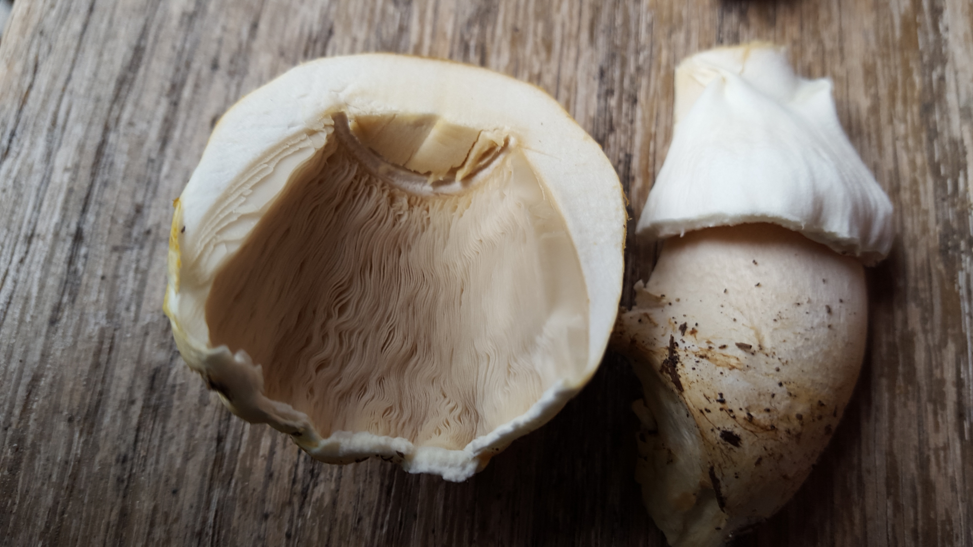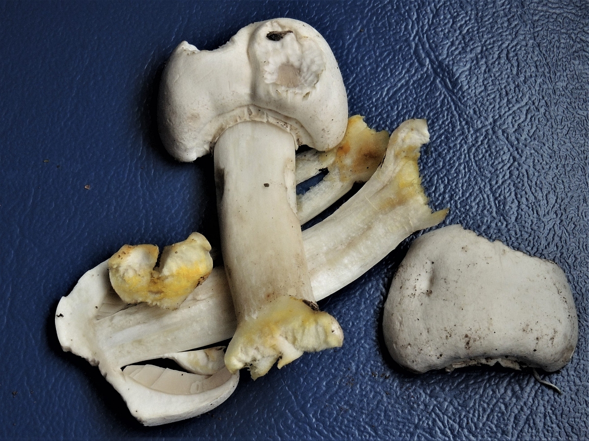 - FK weiß; unregelmäßig, wellig geformte Hüte erst gilbend und dann orangebräunlich verfärbend, Huthaut ca. 2/3 abziehbar, Hutfleisch darunter nicht verfärbend
