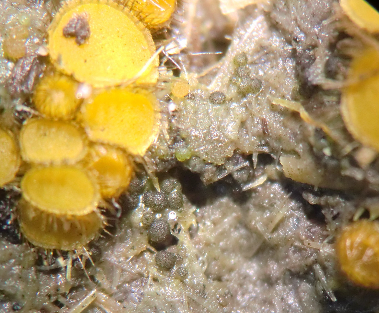 Vor einiger Zeit fand ich auf Rinderdung eine große Vielfalt von Ascomyceten. Unter anderem Cheilymenia stercorea, Schizothecium myriaspora, Sch. conicum usw. Außerdem zahlreiche gelbliche 0,2- 0,5 mm große Saccobolus-Fruchtkörper.