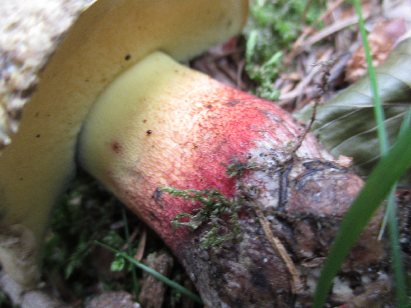 Stiel: ziemlich stämmig, dickfleischig, genetzt, oben gelb, unten rot, ganz oben dort wo die Röhren beginnen eine ringförmige blaue Zone