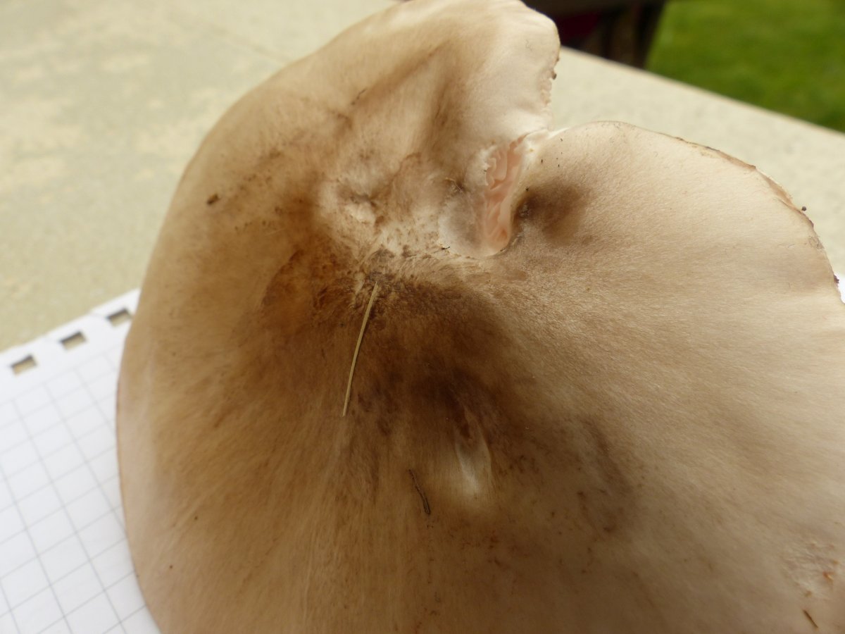 Hut: um 10 cm; seidig, im der Mitte mit feinen bräunlichen Schüppchen, Hutrand: wellig, etwas überstehend