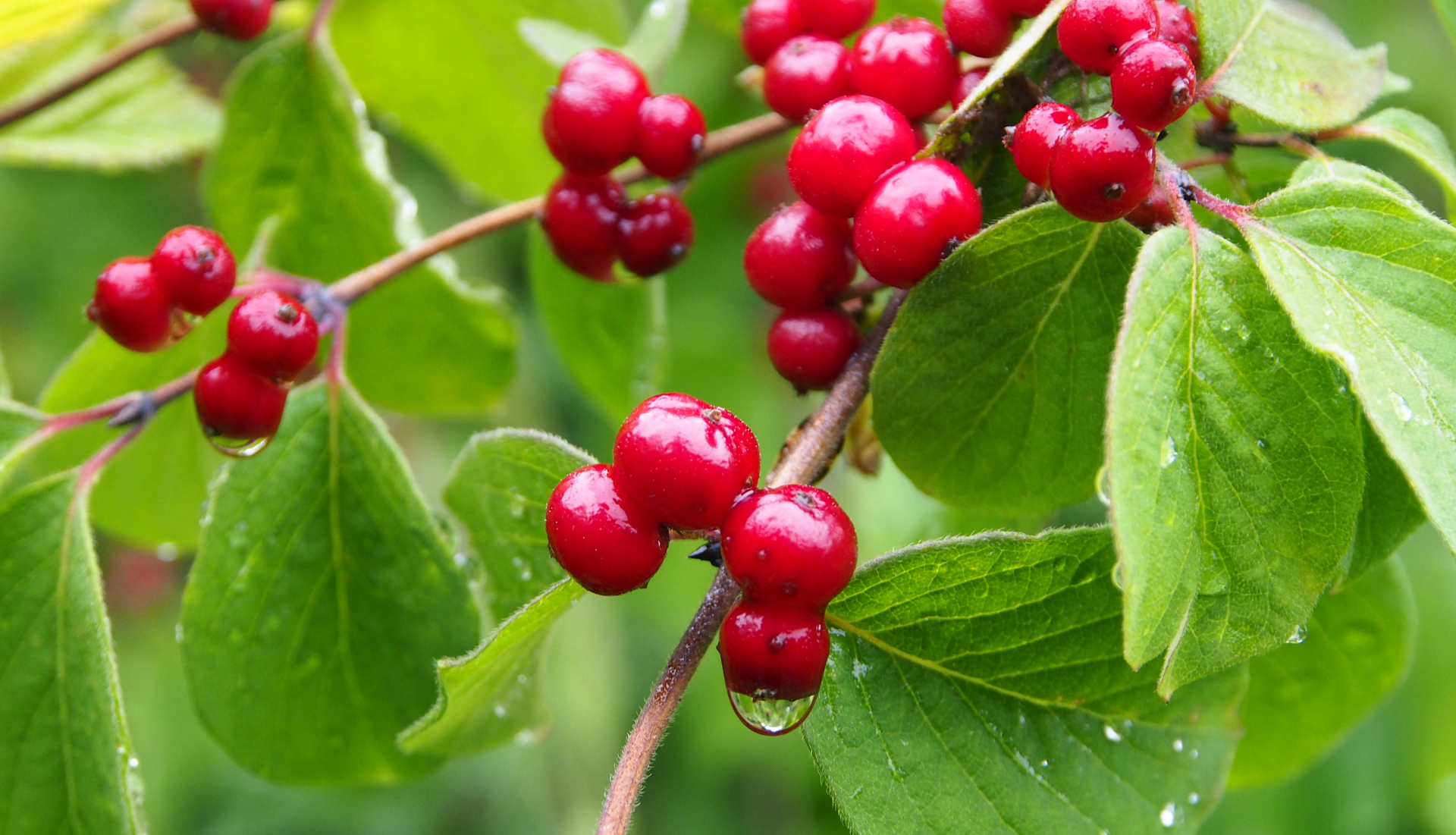1. + 2. Heckenkirsche (Lonicera) nach dem Regen