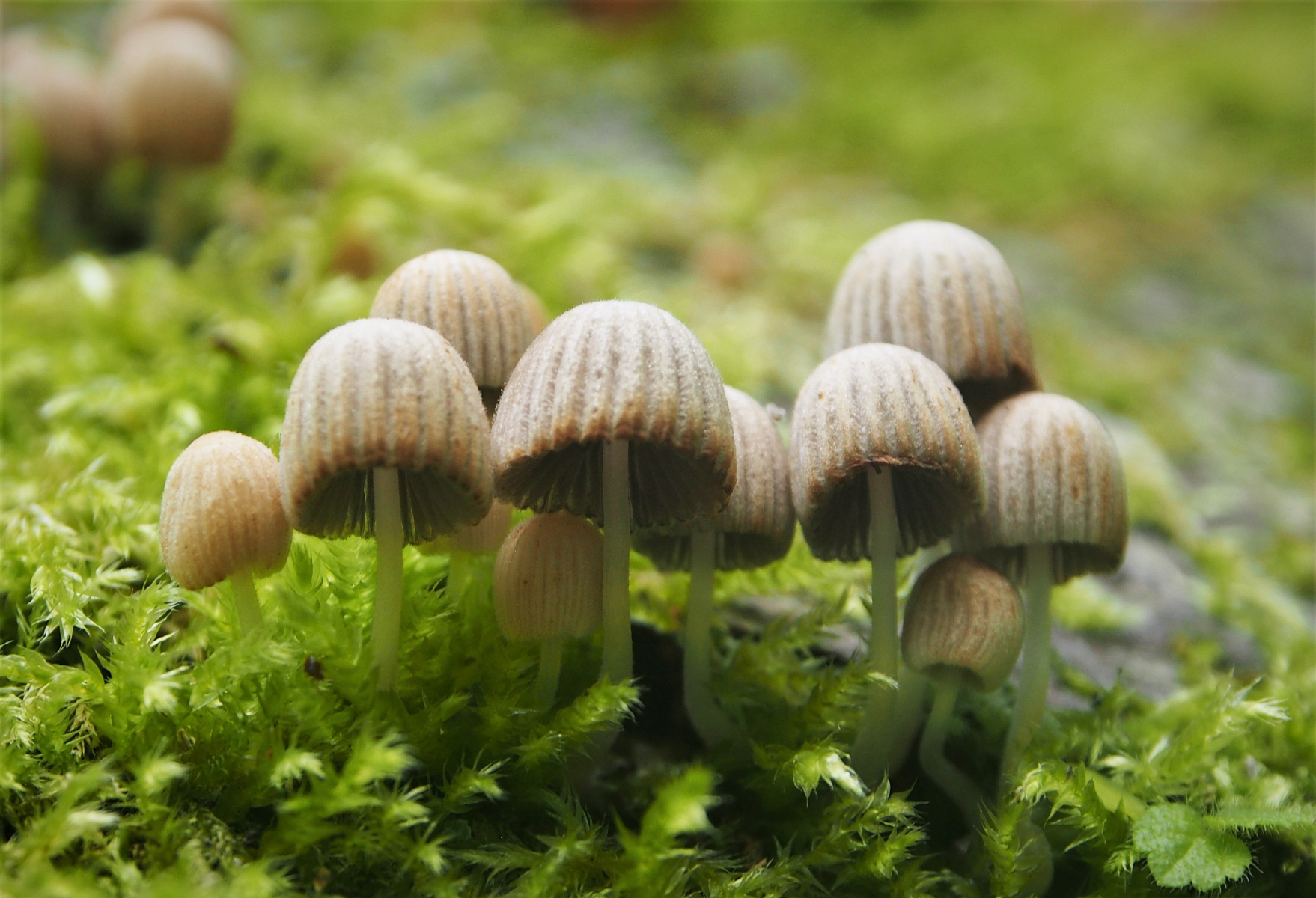 Auf einem moosigen Baumstumpf dann endlich ein Nachweis, dass es auch viele Pilze mit Hut und Stiel auf einem Haufen geben kann: