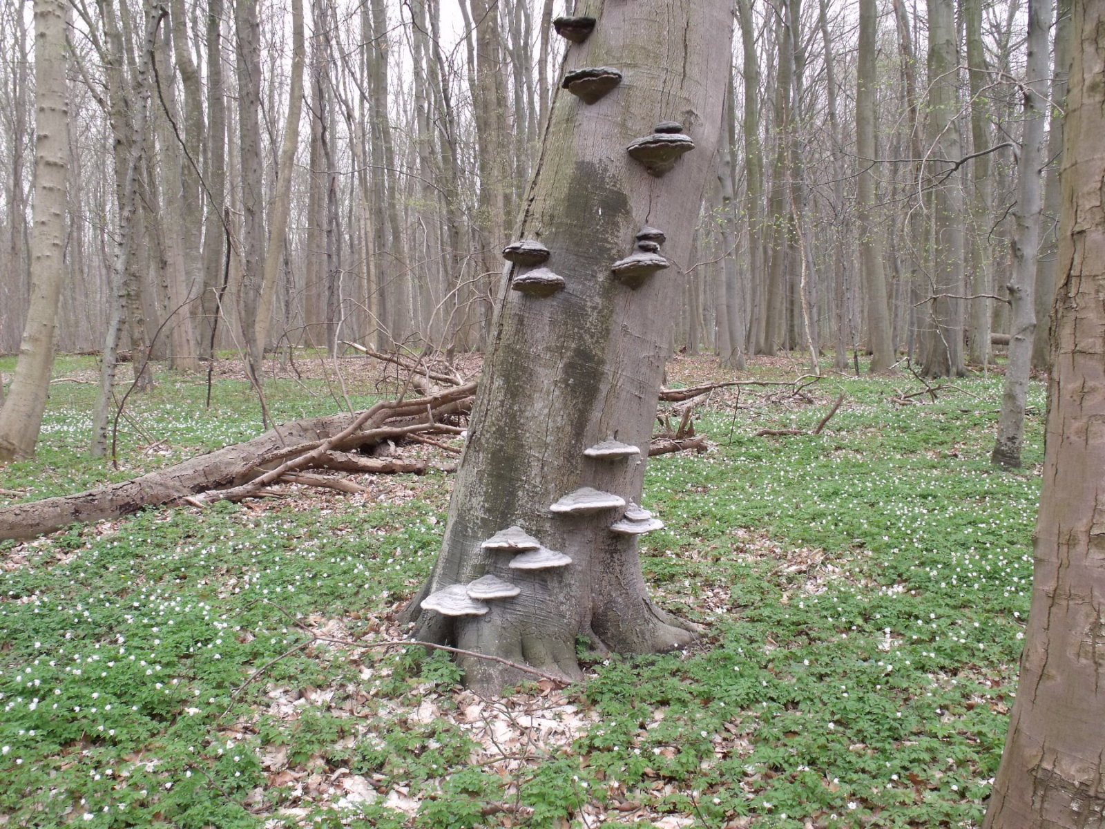 Der Zunderschwamm besiedelt Bäume von unten bis oben. Die Bäume brechen dann bekanntlich in mehreren Metern Höhe ab. Dann "vernascht" er noch den stehenden Stamm und das abgebrochene Teil. Dabei können auch Fruchtkörper dicht über dem Boden wachsen. Aber sooo dicht wie auf dem Bild, an einem vergammelten, bemoosten Stubben, das tut er sich nicht an. Das ist meine Beobachtung, und der Zunderschwamm ist bei uns ein Massenpilz auf Buche und Birke.