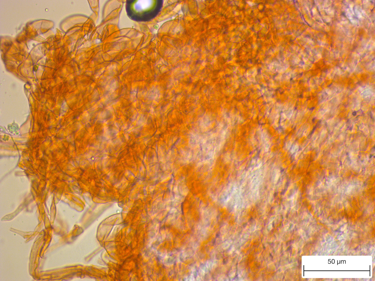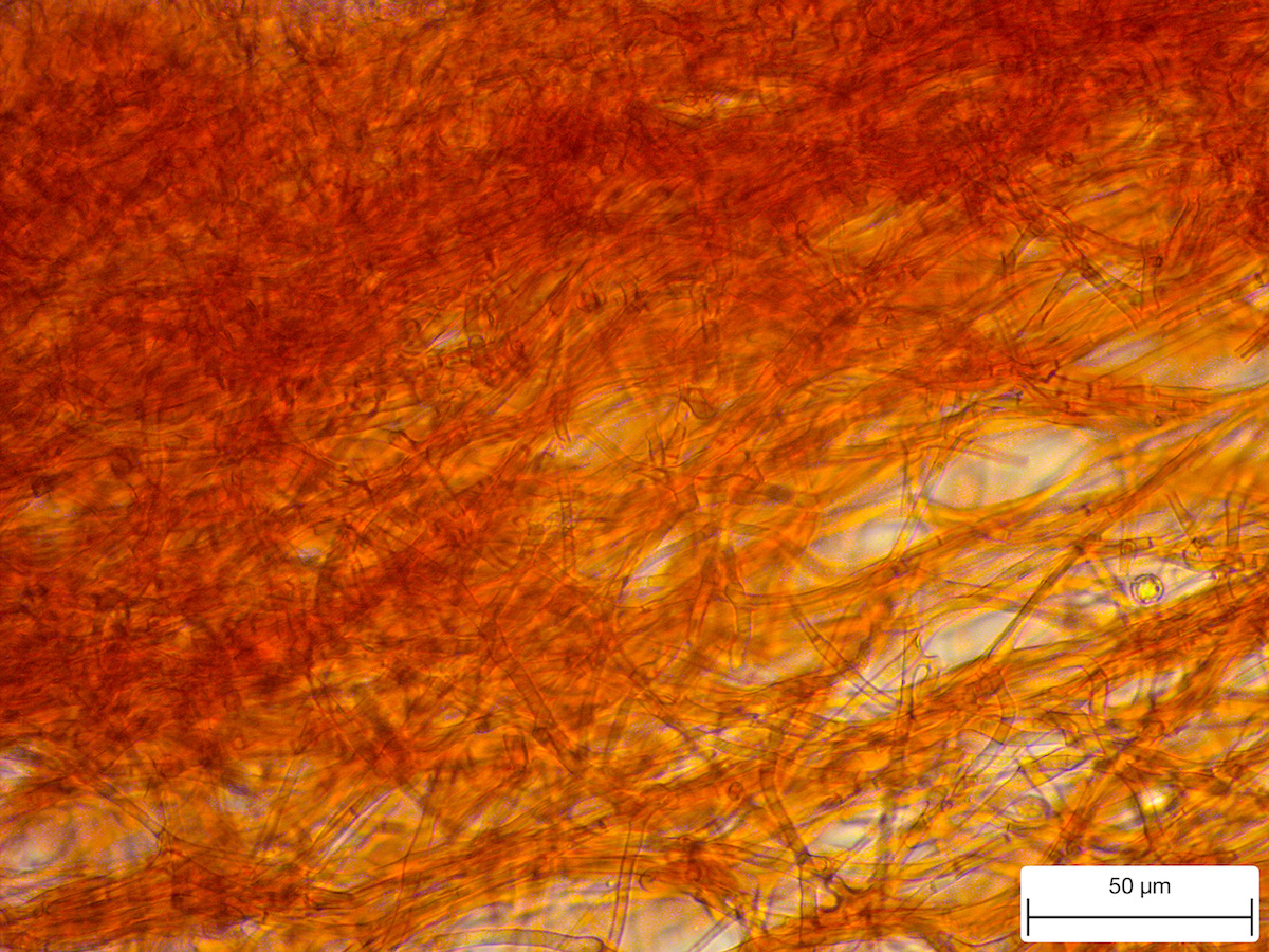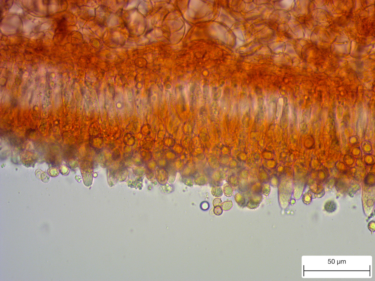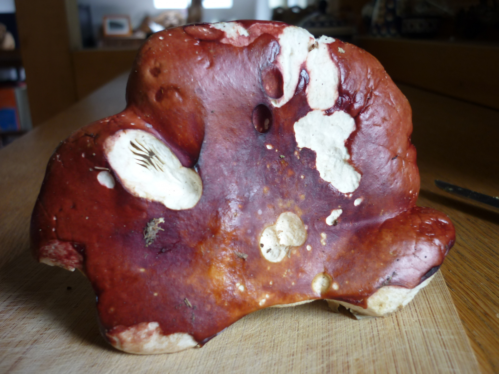 Hut: rotbraun, Durchmesser 12 cm. bis zur Hälfte abziehbar, unter der Huthaut rot