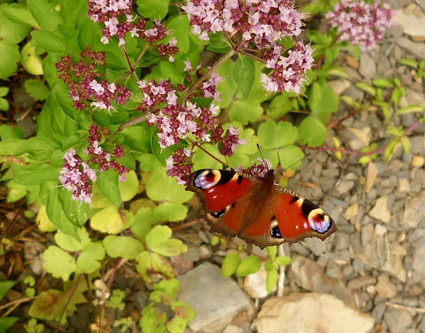Und ich halte die Pflanze auch für ein Oregano-GEwächs. Bei mir wächst er wild an der Hauswand und im Schotter und im Juli sitzen die Schmetterlinge zu Haus auf seinen Blüten. Ich liebe diese Pflanze. Hier ein paar Schmetterlingsfotos am Dost. Wenn Ihr die nicht mögt, nehme ich sie gleich wieder raus.