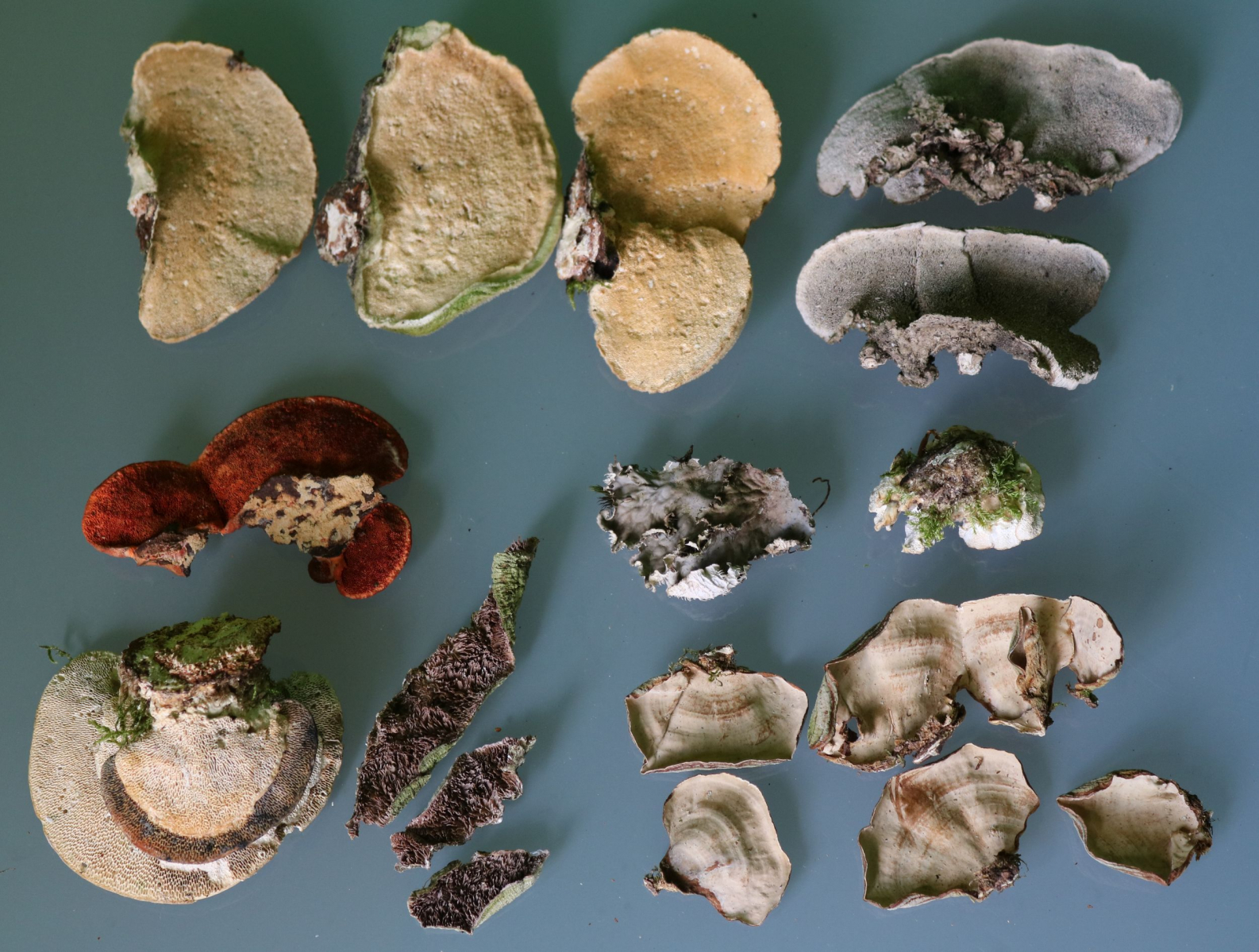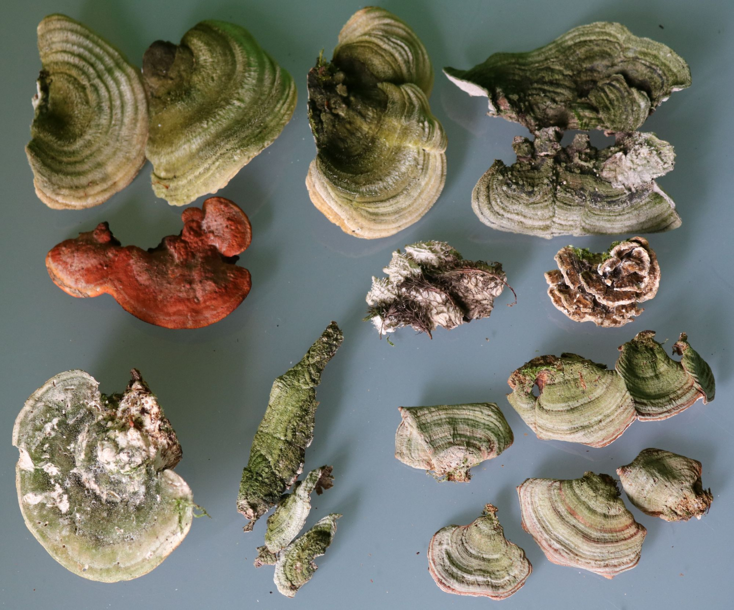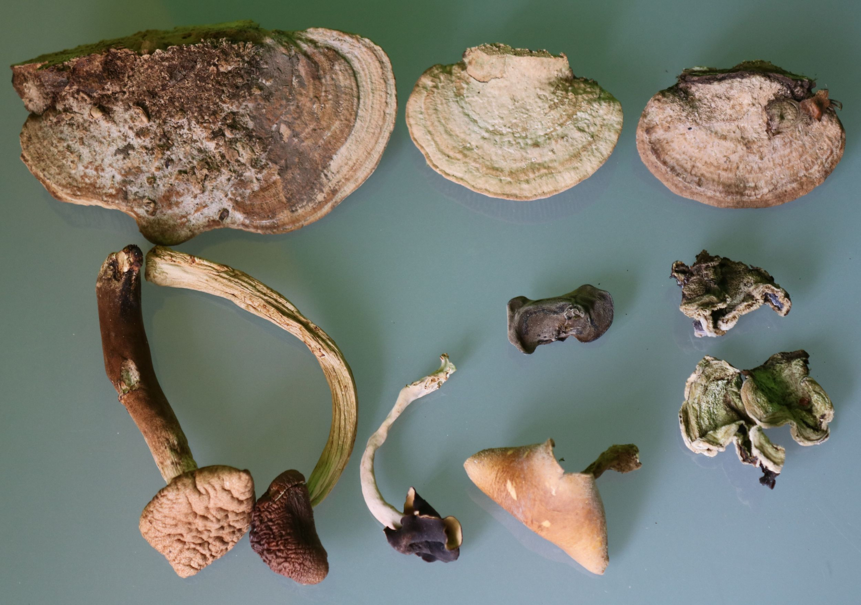 Einmal im Jahr ungefähr muss ich aber auch aufräumen, obwohl keine Tierchen sichtbar waren, bröselt es hier und dort (jetzt auch gerade wieder). D.h. die ganz harten Porlinge bleiben gut bestehen (von Polyporus badius habe ich ein sehr schönes mehrteiliges Exemplar), der Rest wie Schmetterlingstrameten ist nicht so sehr haltbar.