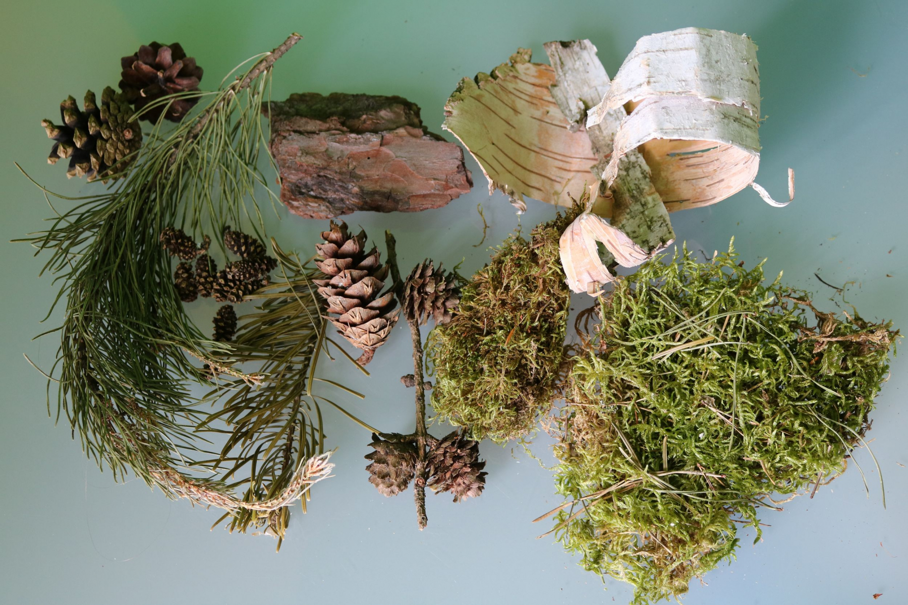 • Kiefer (Astspitze, alte Zapfen vom Vorjahr, kleine junge Kiefernzapfen von Mitte Mai, Rinde)