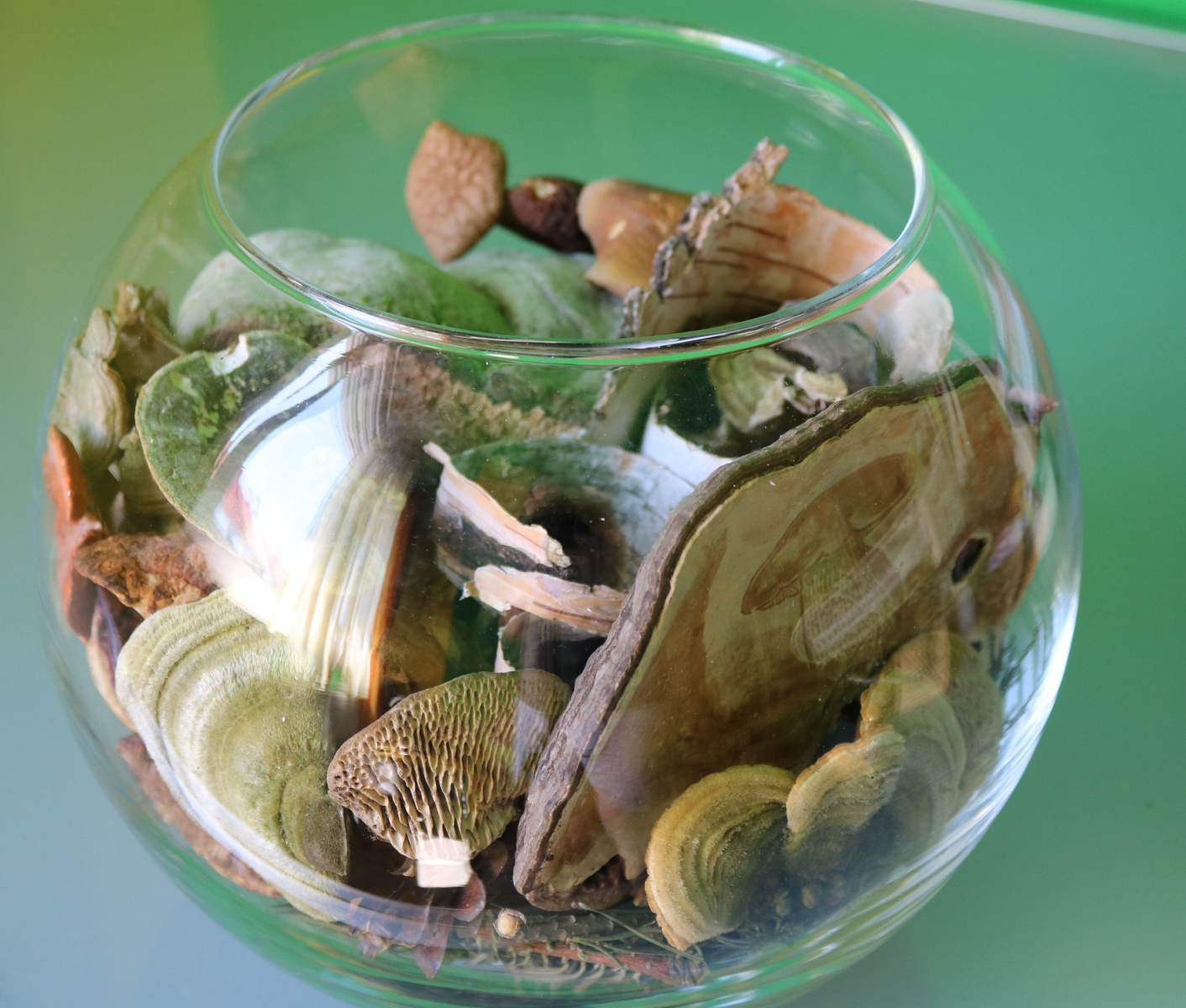 • Glas ist auch eine gute Idee. Bei mir liegen die ganzen gesammelten und getrockneten Lieblinge neben Zapfen, Fruchtständen, hübschen Steinen, Schneckenhäuschen etc. in Ziertellern oder Schalen und stehen überall im Haus rum. Alle paar Monate wechsle ich dann mal ein paar Teile aus, weil ich ja regelmäßig aus dem Wald wieder was mitbringe. Entsorgen kann ich eigentlich nur schweren Herzens was, aber mit der Zeit blassen viele getrocknete Pilze aus - und manchmal sind auch noch kleine Bewohner drin und dann beginnt es plötzlich zu rieseln. ==3
