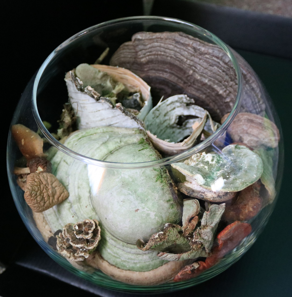 Die Pilze sehen ja alle noch tipp-topp aus. Ich habe natürlich auch hin und wieder meine Fundstücke dekorativ "abgelegt", in einer großen Schale - kleinere Pilze und auch Flechten (aus Spanien, die duften noch) in einem kleineren Glas (ohne Vorbehandlung)