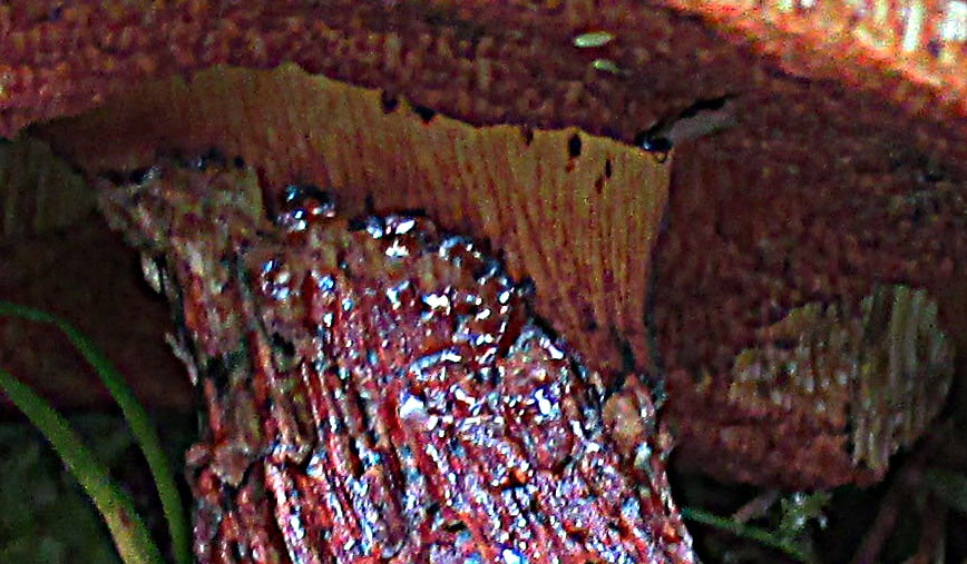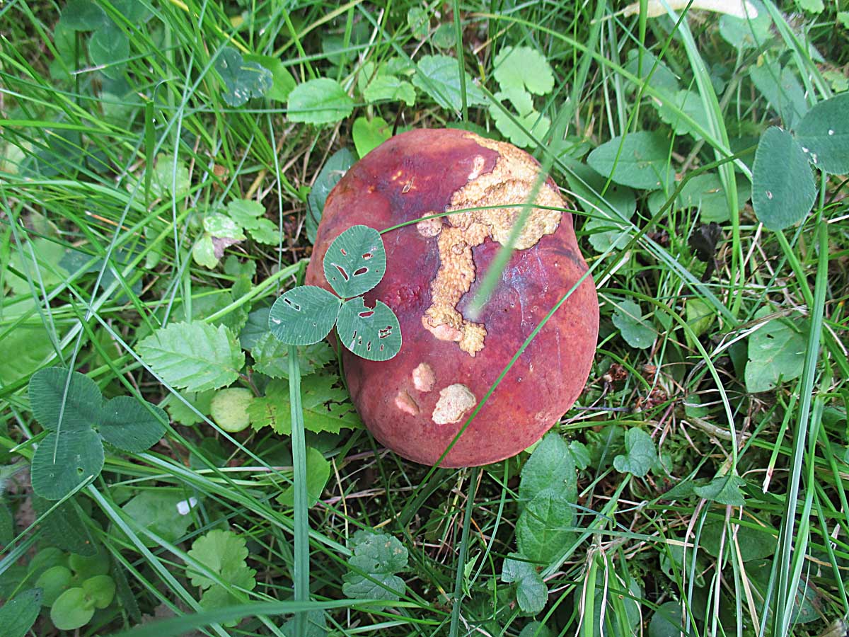 ich habe heute auf meiner Parktour diesen schon von Schnecken malträtierten Hexenröhrling gefunden. Leider ist am Stiel nicht mehr viel zu erkennen aber farblich könnte es schon S. mendax sein. Fundort unter Eiche. Was vom madigen Fleisch noch zu erkennen war ist die Farbe gelb im Hut und Rot im Stiel. Ein rötlicher Röhrenboden war auch vorhanden.