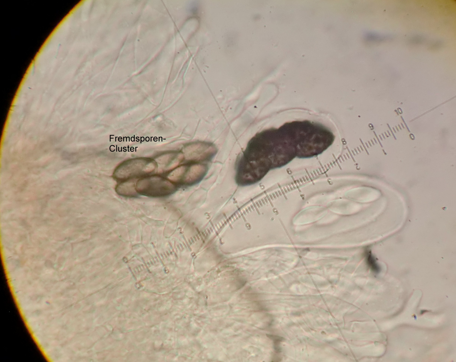 Sporencluster 33 - 39 x 12 - 16 µm mit Gelhülle, Einzelsporen 12 - 14 x 6 - 7 µm mit unregelmäßigen großen Warzen bis gut 1µm Höhe. Ascusgröße 65 - 90 x 22 - 25 µm. Paraphysen ohne sichtbaren Inhalt.
