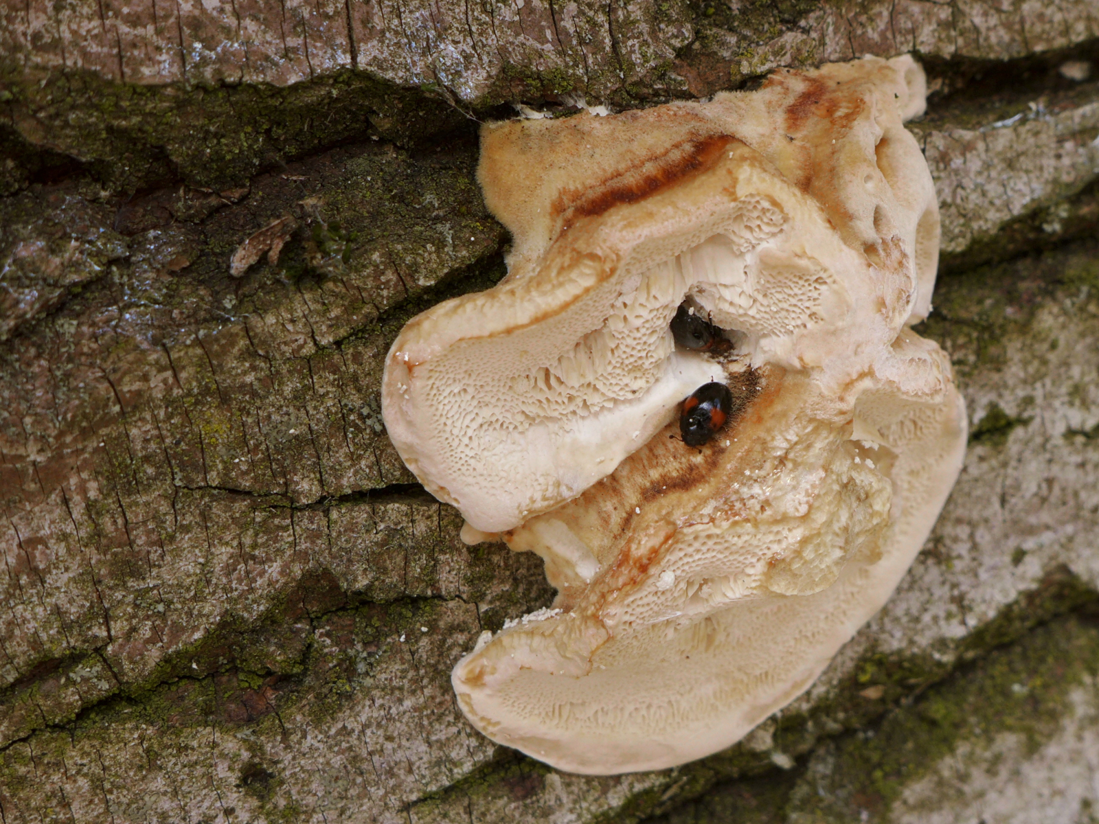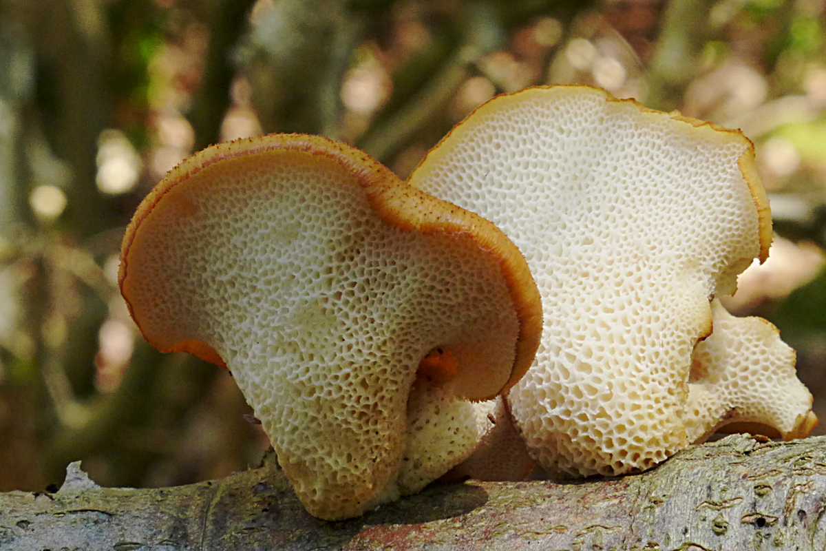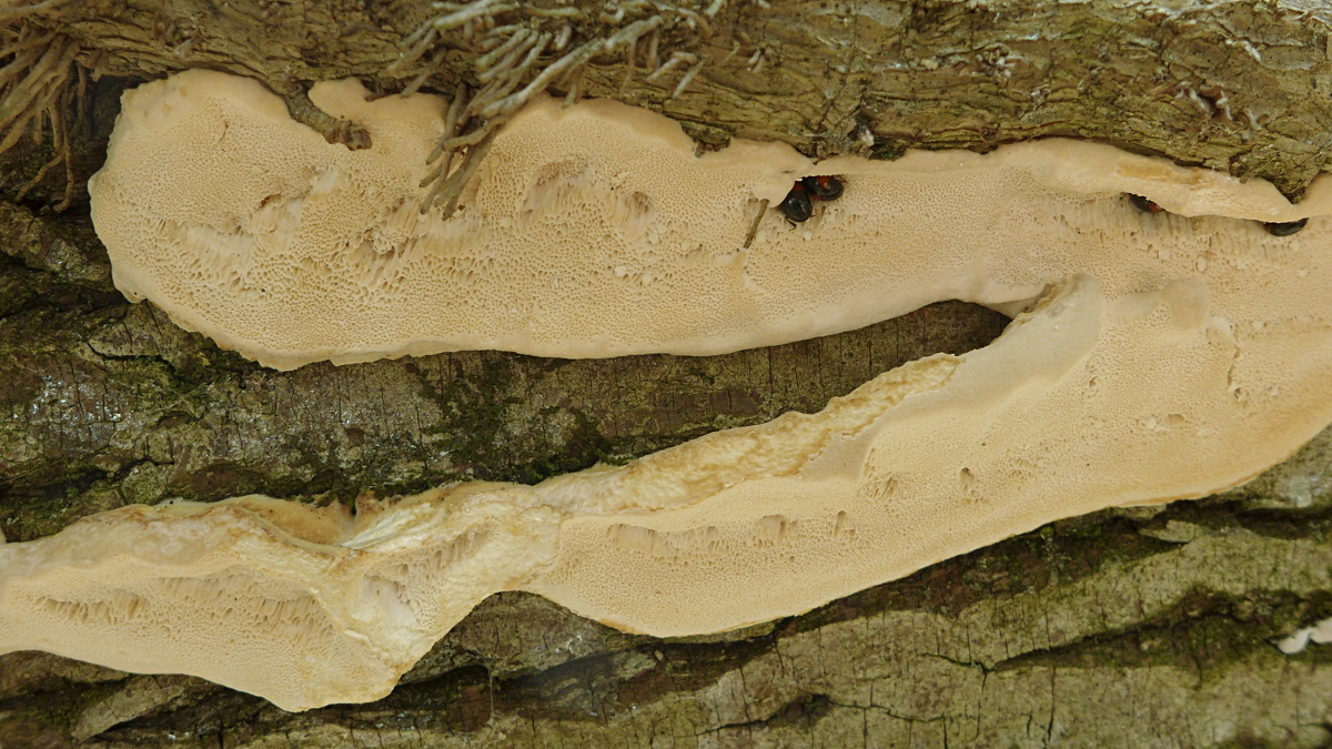 Die Poren wirken für P. alveolaris relativ klein, aber für Polyporus tuberaster zu groß - allerdings fehlt auch der Größenvergleich: es waren kleine Pilze auf dünnem Buchenast, der ursprünglich frei in der Luft zwischen anderen Ästen hing.