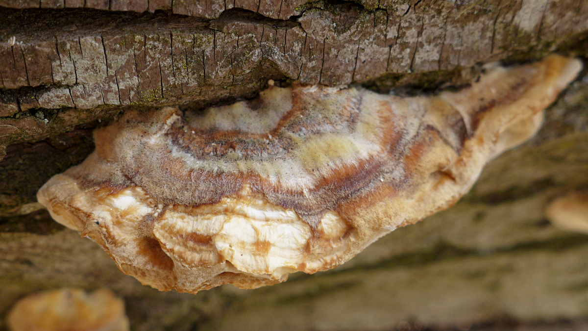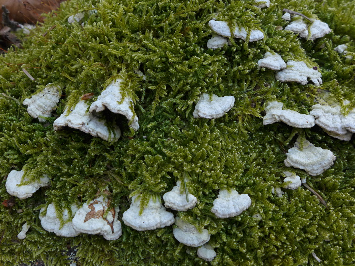 Gleich ein Problempilz am Anfang, viele relativ kleine einzelne Porlinge mit dicker Ansatzstelle und auch mit größeren resupinaten "riegelartigen" Bereichen an einem umgestürzten, frei in der Luft hängenden Salweiden-Stamm. Wegen der zonierten Oberfläche ist es eine Tramete. Immer noch suche ich Trametes ochracea, die hier nicht oder scheinbar nicht vorkommt. Bisher haben sich alle relativ hellen (noch kleineren) Trameten nach weiterem Wachstum doch als Trametes versicolor entpuppt.
