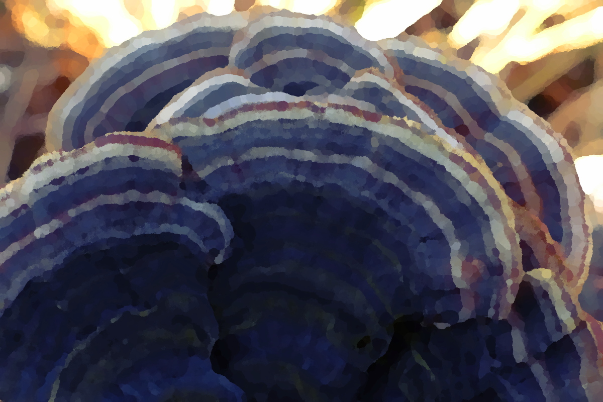 Dann doch lieber etwas Eindeutiges: meine bläulichen Trametes versicolor (Nachbar-Ensemble vom Fotowettbewerbsbild vom April) spielerisch bearbeitet.