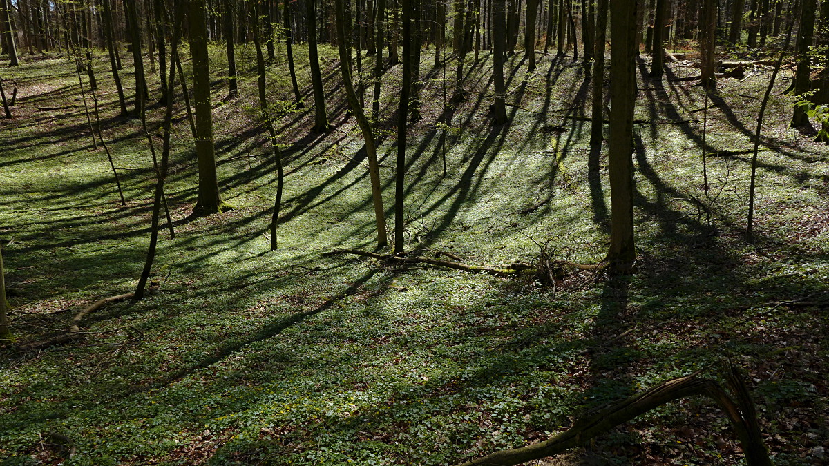 Doline im Kalk-Buchenwald mit lauter Scharbockskraut, Ficaria verna im April, Licht und Schatten.