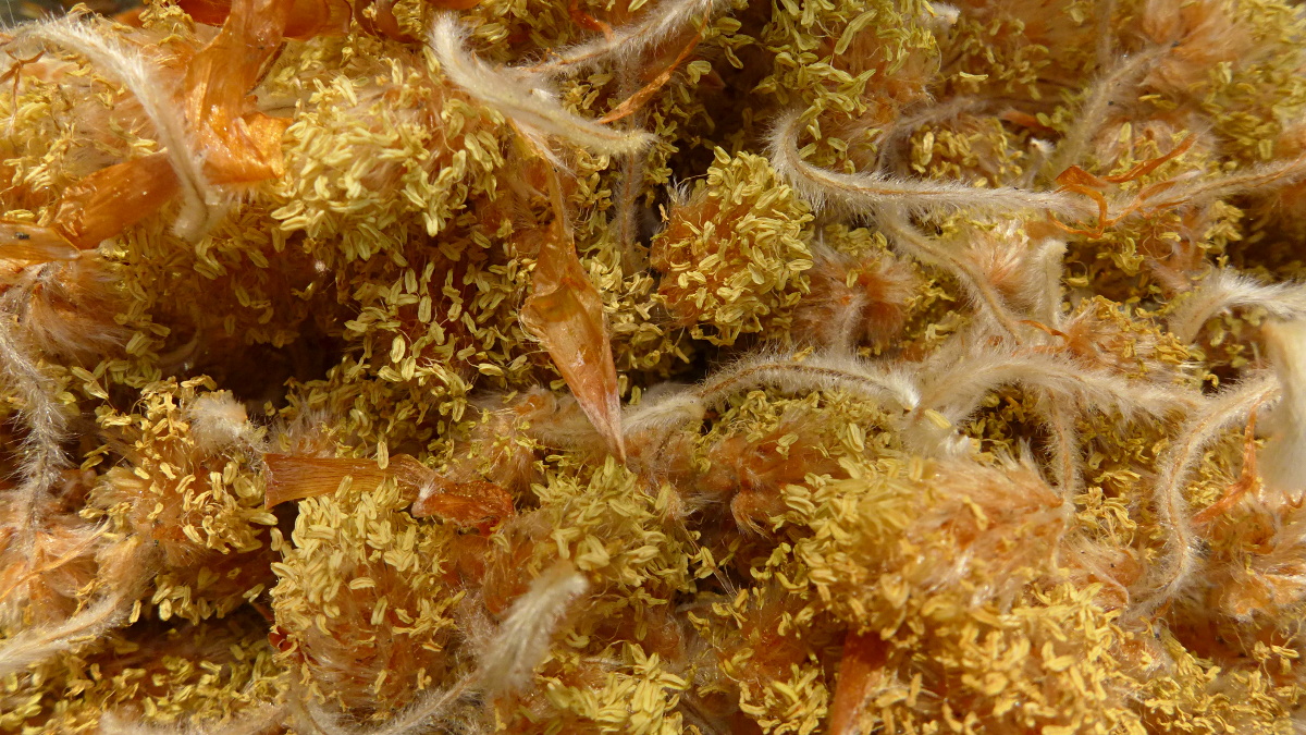 Und das ist wieder meine Tremella mesenterica (vom Fotowettbewerb im Mai), im eingetrockneten Zustand, sehr orange-rot-braun und alles mit Fichtenpollen besprenkelt. Inzwischen ist der Pilz in meinem Balkonkasten-Biotop dunkelbraun.