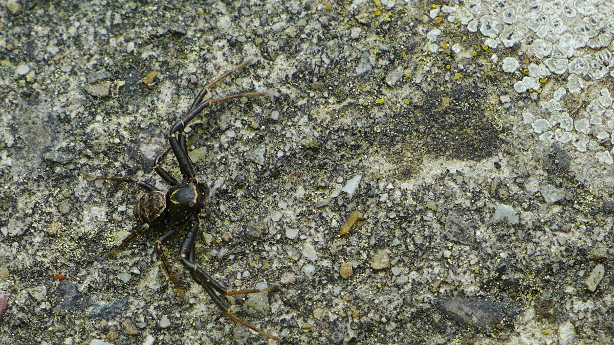 Eine eilige kleine Krabbenspinne, in Schwarz-Braun-Gold. Nach Bildvergleich müsste es ein Männchen von Xysticus kochi sein.