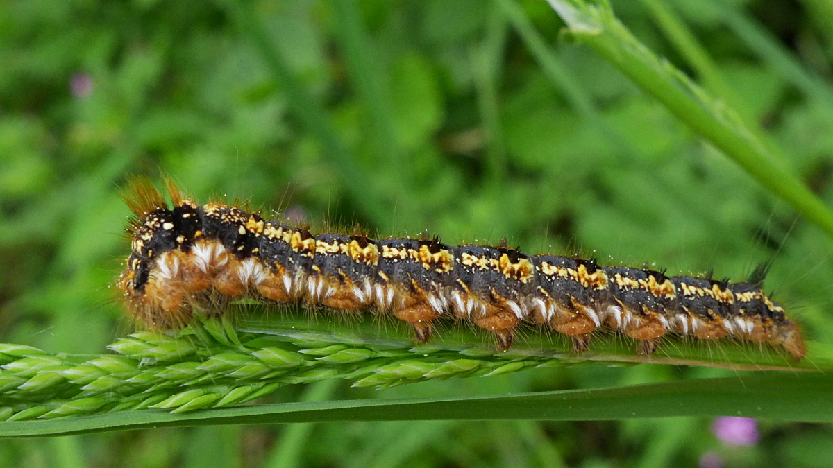 Am Waldrand, die Raupe der Grasglucke, Euthrix potatoria