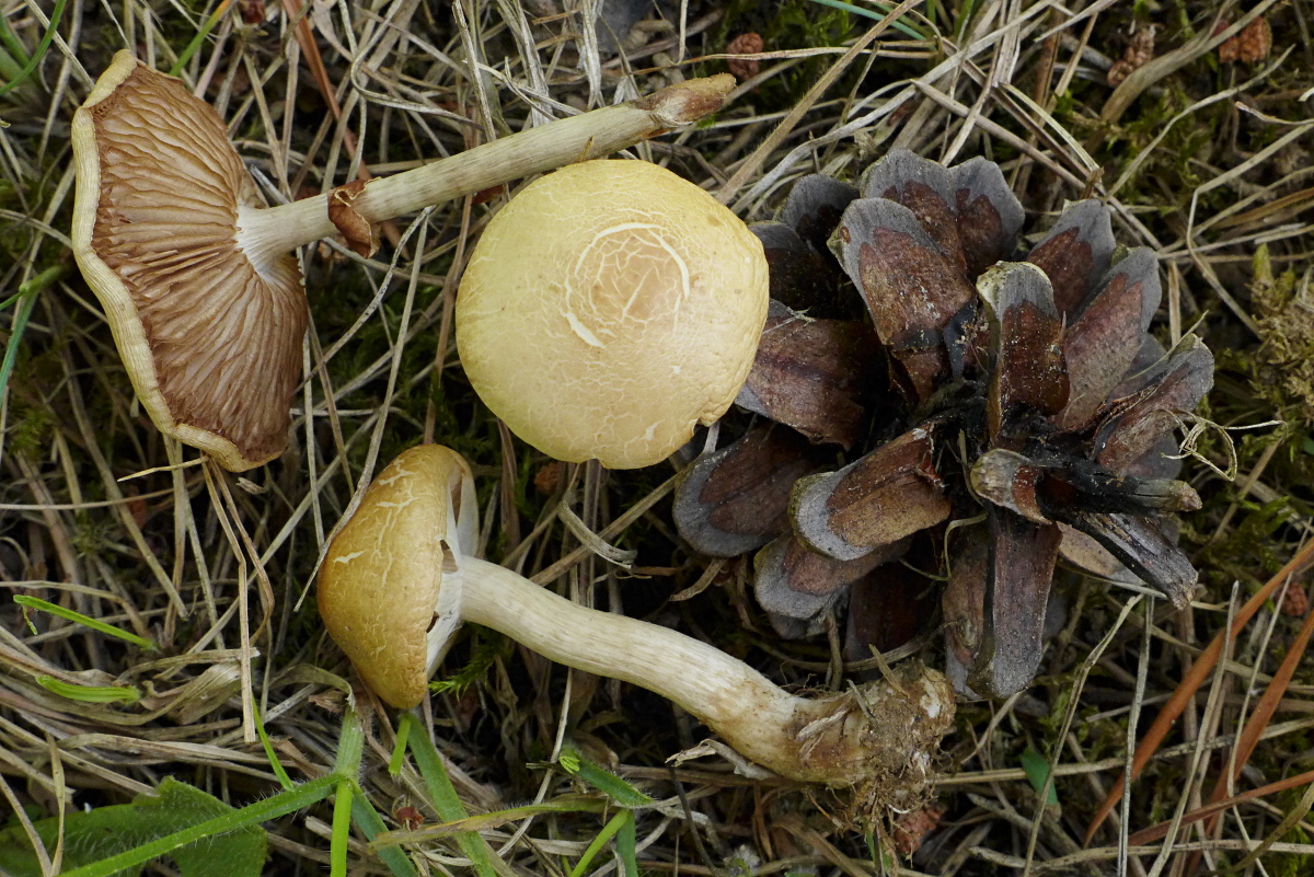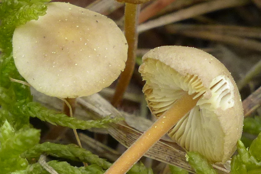 --> wegen der sehr hell erscheinenden Lamellen könnte/sollte es sich eher um Weißsporer handeln. Als Möglichkeiten sollte man Strobilurus (wg. der Kiefern) oder Marasmius in Betracht ziehen (leider habe ich keinen Sporenabdruck gemacht, allerdings waren die Pilze auch f..rztrocken.)