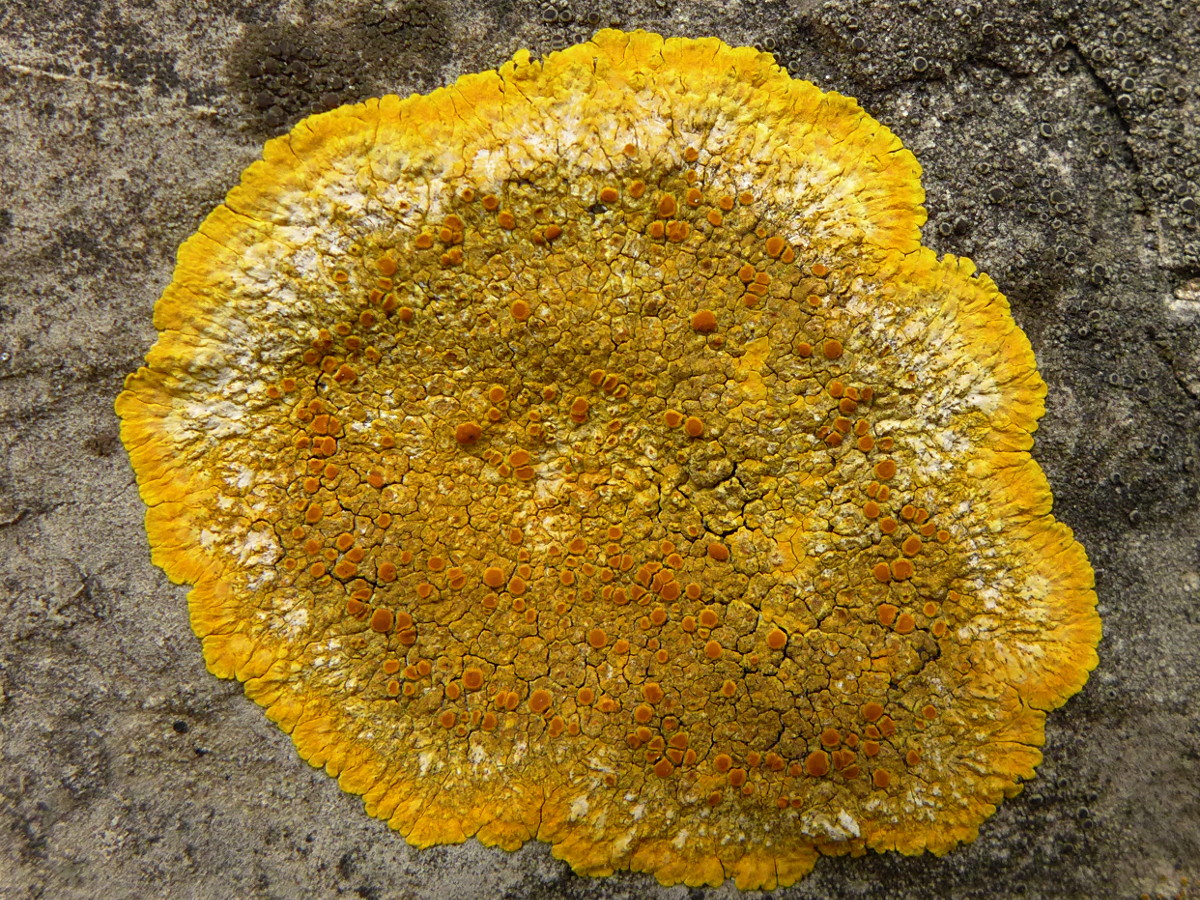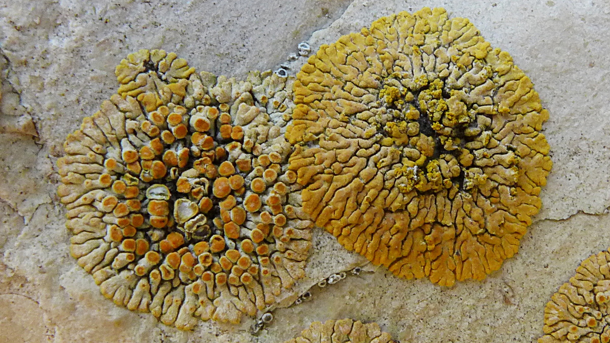 Flechten sind ja auch Pilze, hier auf Kalksteinmauer: