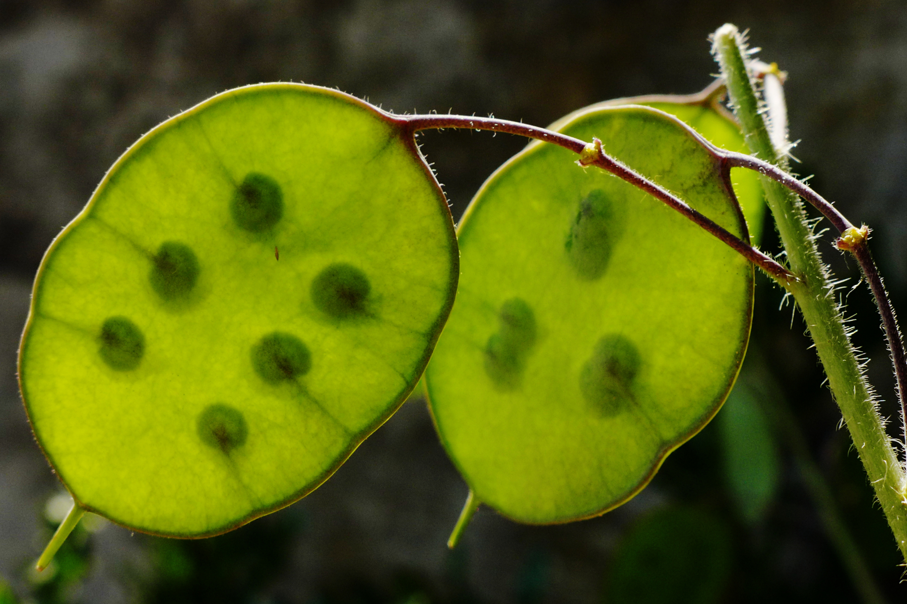 Auf dem Weg in den Wald, "frühreife" Früchte von Lunaria annua, Silberblatt