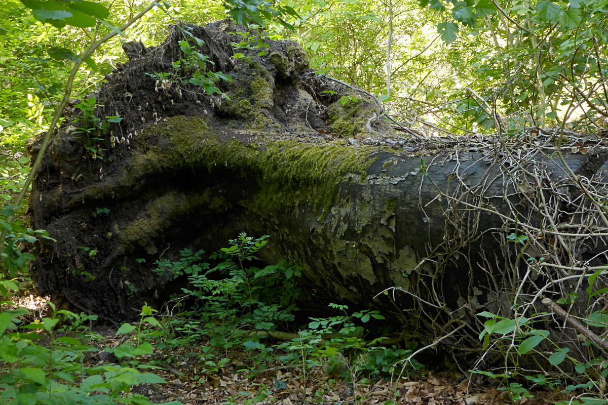 An so einer umgestürzten Buche müsste es doch Pilze geben ...