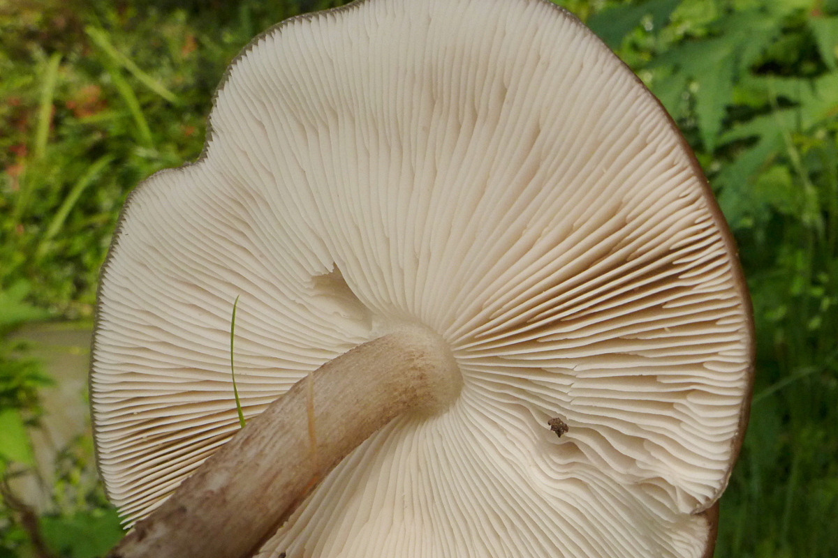 Beim Umdrehen war ich enttäuscht und vermutete wegen der sehr weißen Lamellen (der auf dem Bild zu ahnende rosa Schimmer war vor Ort nicht sichtbar, jedenfalls ist mir da nichts aufgefallen) und des Burggrabens einen Weichritterling, KEIN GERUCH war feststellbar.