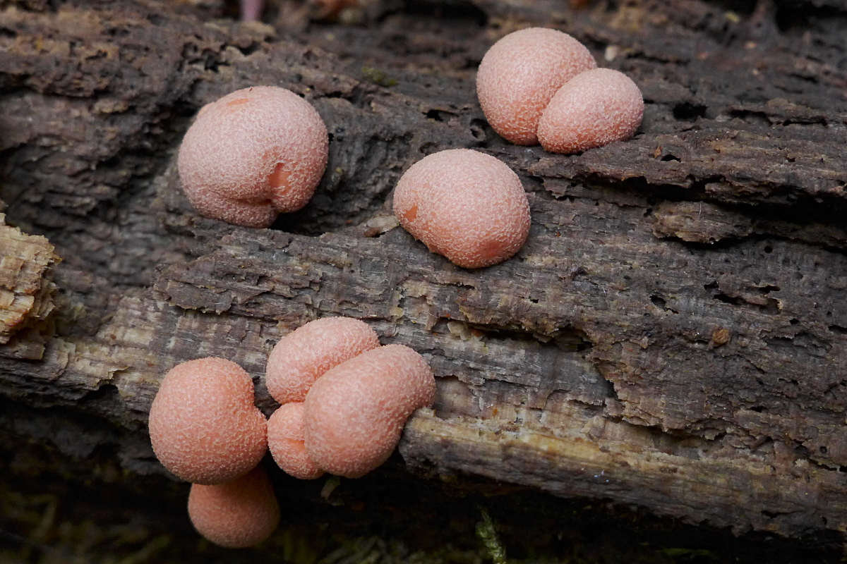 Im Mai im Wald, die einzige schöne Kollektion von Lycogala cf. terrestre, Blutmilchpilz (wg. des aneinander gedrängten Wachstums) auf morschem Holz
