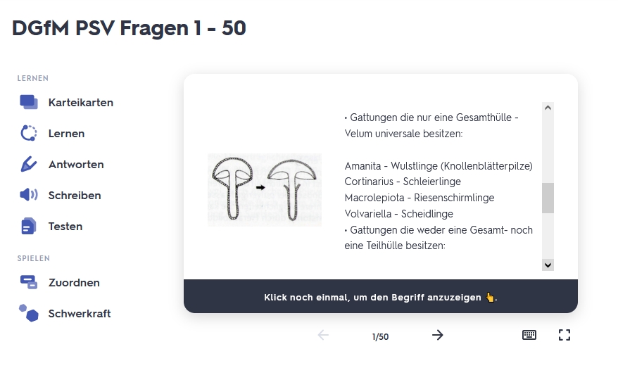 Insgesamt sollte man darauf achten, dass man später mal zu einem Pilzsachverständigen/-berater und nicht zu einem Quizletkärtchen-Beantworter wird. Das ist ein aus dem Schulunterricht bereits bekanntes generelles Problem des Lernens mit Quizlet. Es verführt zum sturen Auswendiglernen und mag für Fremdsprachenvokabeln geeignet sein, kaum aber als Vorbereitung auf eine Beratertätigkeit.