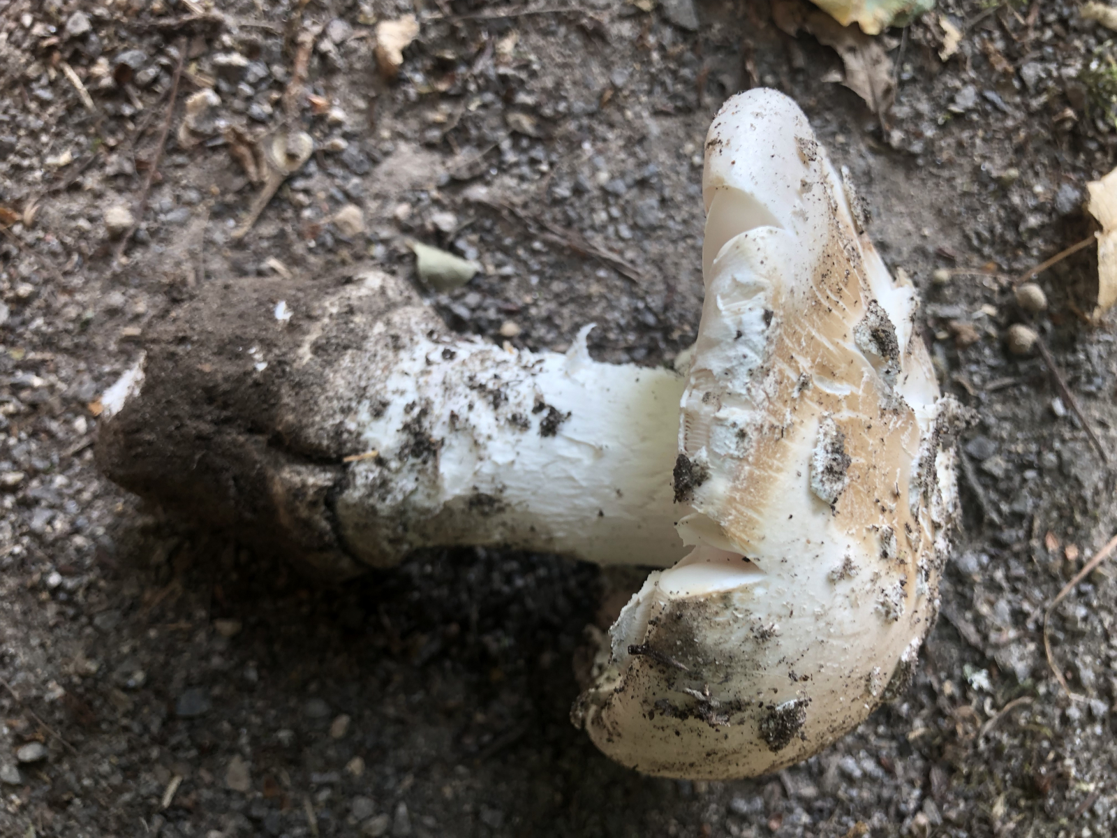 ich sehe keine Scheide, aus der der Knolli gewachsen sein könnte. Ich sehe an der Stielbasis vllt eine Vorwölbung, die offensichtlich um die gesamte Stielbasis drum herum geht. Es ist ja auch viel Schmutz drum herum. Ich sehe eine "Wurzel". Das viele Velum an der Hutunterseite über den Lamellen lassen mich vermuten, dass es sich um den fransigen Wulstling handeln könnte.