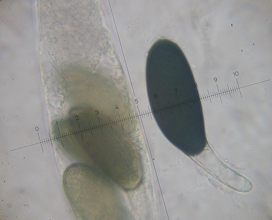 Sporen: 50-60 x 25µ, Pedicel 25-30 x 7-10µ, an beiden Seiten mit langen (200 x 15-20µ) und teils sehr breiten Anhängseln die sich mit Kresylblau anfärbten.