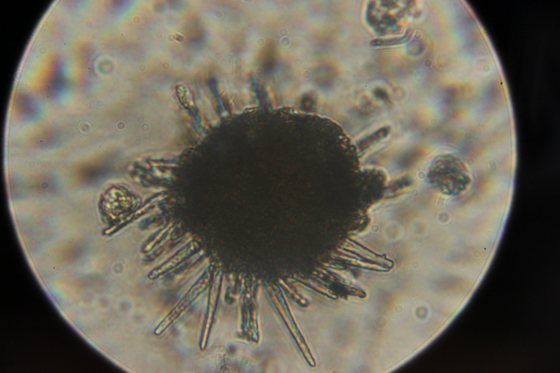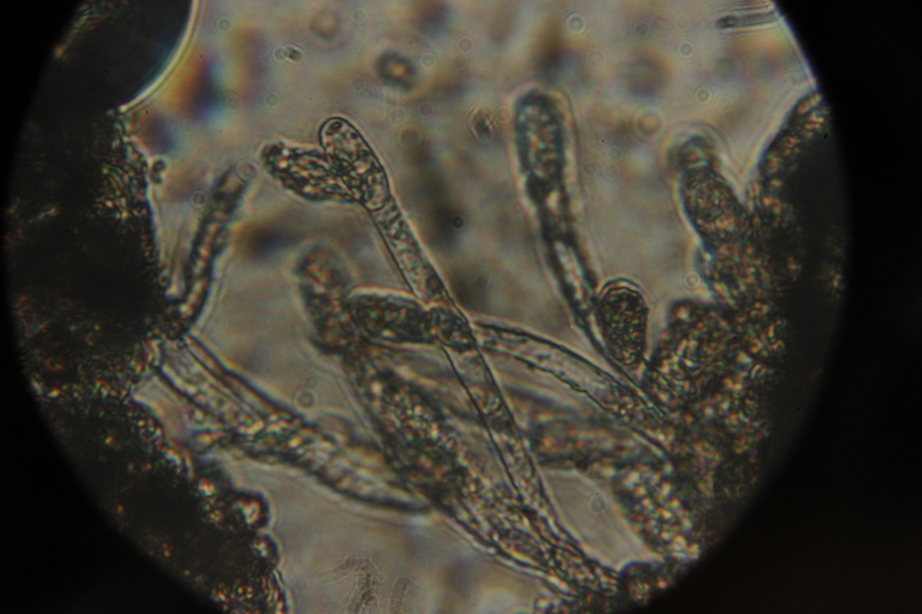 Die Setae siehst du am besten, wenn du (waagerecht oder schräg) mal ein hauchdünnes Scheibchen (max. 0,1mm dick) quer aus dem Hymenium raussäbelst, so daß du quasi ein Netz auf dem Objektträger liegen hast. Das muss dann auch nicht unbedingt in Wasser (KOH eh nicht, das macht ja das Präparat noch dunkler), sondern kann man auch ohne Auflage in Luft betrachten.