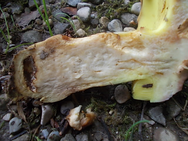 ich gebe Felli und Beli völlig recht. Das ist Butyriboletus subappendiculatus - zu deutsch Nadelwald-Anhängselröhrling oder hier bei uns "Gelber Steinpilz" (ist aber natürlich kein Steinpilz). Man sieht schön das sehr feine, gelbe Netz am Steil (so sieht das bei Ziegenlippen nie aus). Die Rosa Färbung in der Stielbasis ist typisch, auch das weiße Fleisch - nur die Stielrinde ist gelb.