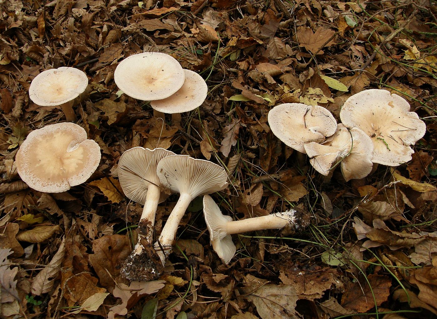 Hast du da mal reingelinst? Oder einen Sporenabwurf gemacht? Da liegt so ein Farbreflex auf den Lamellen, als wäre das Sporenpulver nicht weiß(lich), wie bei Nebelkappen (cremeweiß), sondern kräftiger gefärbt. So wie eben bei den meisten Lepista - Arten. Leucopaxillus glaube ich da eher nicht: Da hätten die meisten Arten bei so stark aufgeschirmten Hüten doch mehrr oder weniger deutlich erkennbare Rippen am Hutrand.