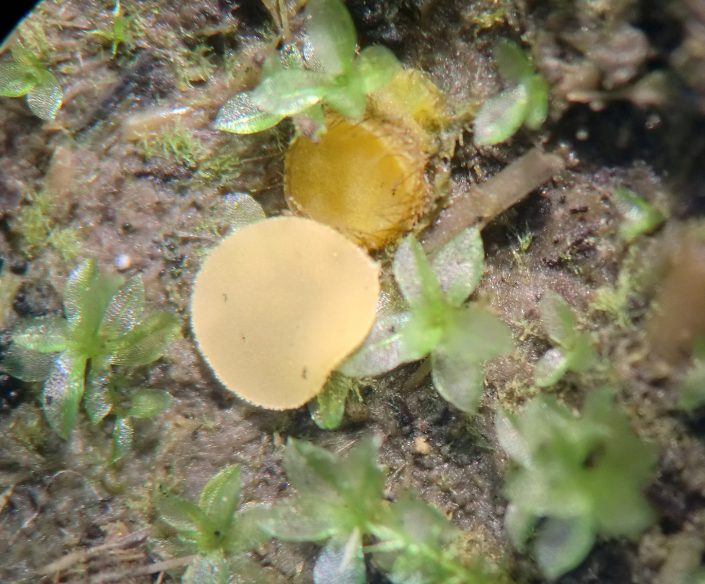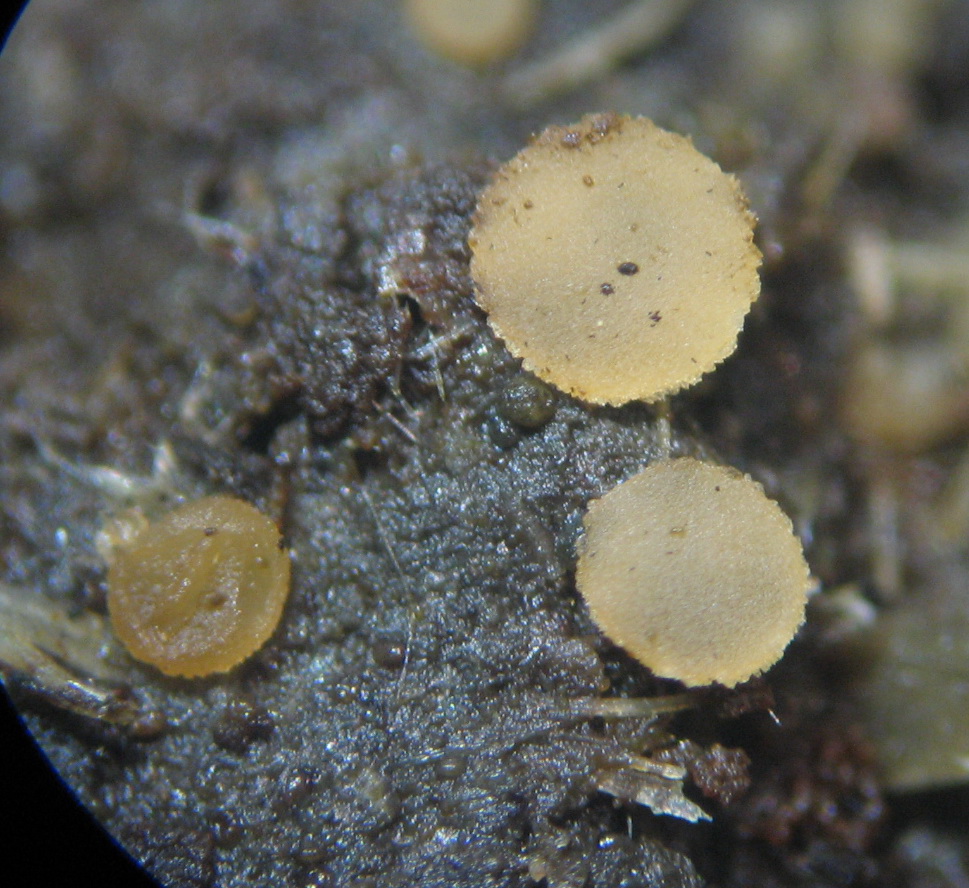 vor ein paar Tagen habe ich nochmals bei den Rinder-Fladen vorbei geschaut. Unglaublich! Die sind da jetzt schon vor ca. 3/4 Jahr (vermutlich beim Alm-Abtrieb im Okt.) fallen gelassen worden und fruktifizieren immer noch. Im Schatten von Huflattich-Blättern usw. hielt sich genug Feuchtigkeit. Neu gibt es mehrere blass ockergelbliche, sitzende Apothezien von bis zu 2,3 mm Durchmesser, die aber keine Haare haben.