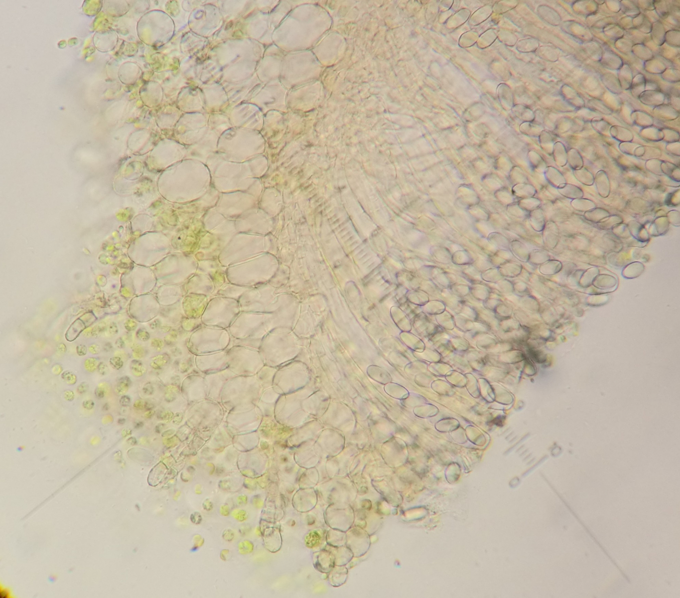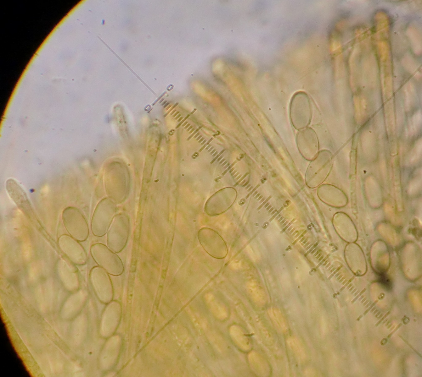 Paraphysen: ohne erkennbaren farblichen Inhalt (allenfalls in der Masse blass gelblich?), apikal auf bis zu 5,5 µm leicht keulig verdickt, septiert.